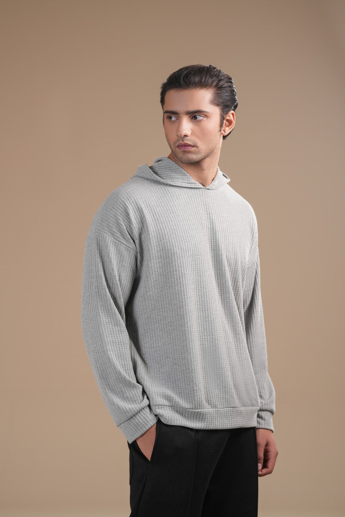 Pullover Hoodie Made From Textured Waffle Knit Fabric. Timeless Grey Shade Offers A Clean, Minimal Look With Soft Warmth And Everyday Winter Comfort