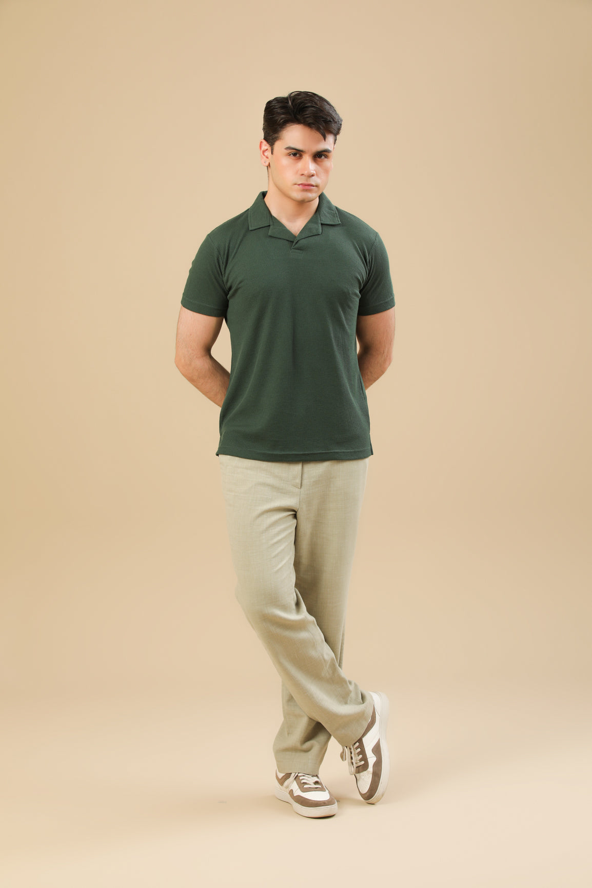 Experience ultimate comfort and style with our Waffle Bottle Green Revere Polo. The lapel collar and knitted texture add a touch of sophistication, while the silicon wash ensures a soft hand feel. Designed for a smart fit, this polo is perfect for any occasion.