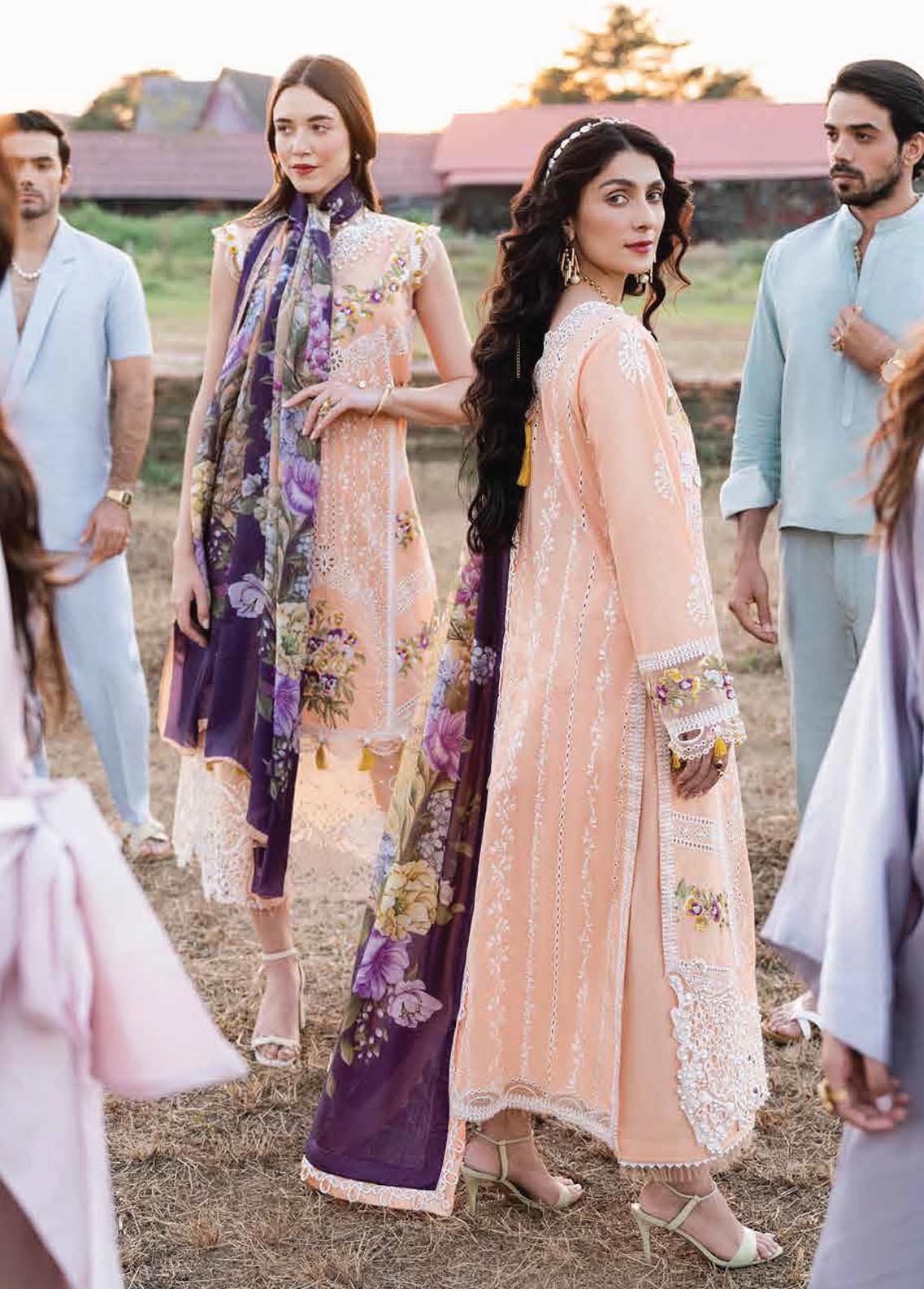 FAH means sky in Thai, and the name plays the perfect metaphor to the silhouette of this beautiful number. Curated on a very subtle and light shade, this attire brings the best out of the wearer. The embroidered neckline motifs, and all the panels of the upper create a simple yet graceful look. The ensemble is completed with a dark purple pure silk dupatta printed with a floral theme. A design like Fah can be the highlight of your summer wardrobe.