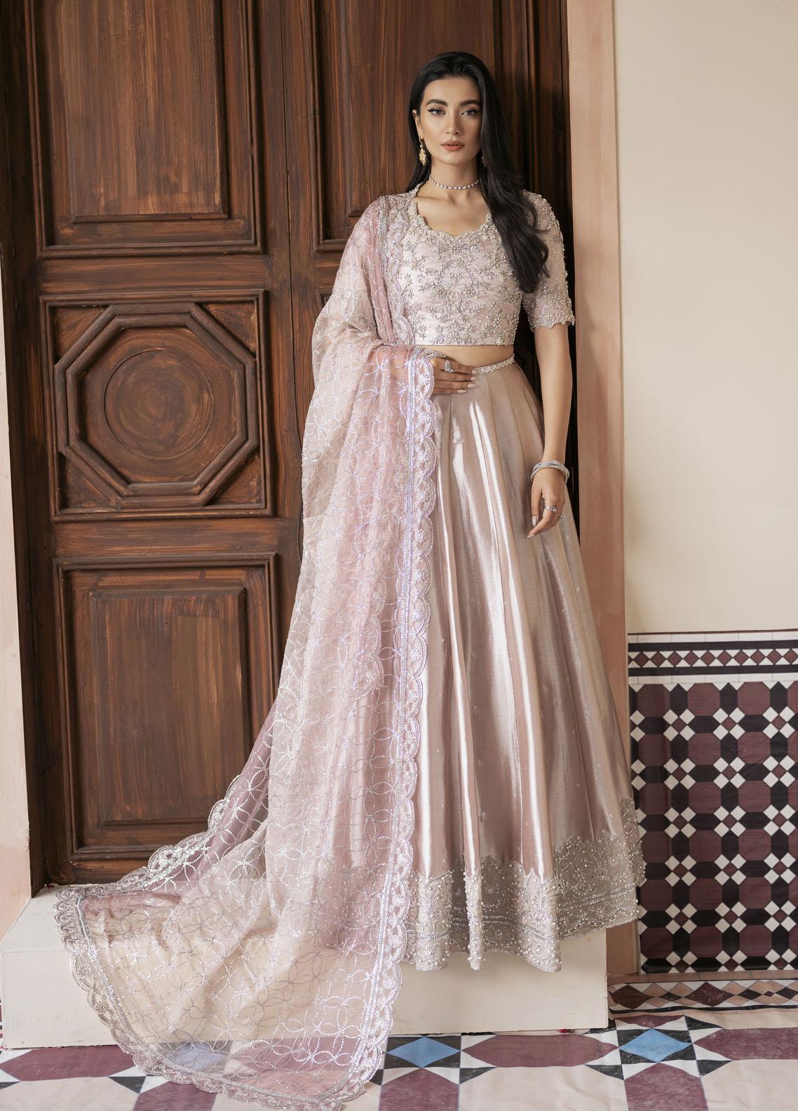 Personifying a unique feminine charm, this outfit pays tribute to the old world charm with a contemporary appeal. A tissue silk lehenga paired with a heavily handworked jamawar choli creates an impactful ensemble for the upcoming season. It is paired with a heavily sequinned ombre net dupatta creating a splendid look