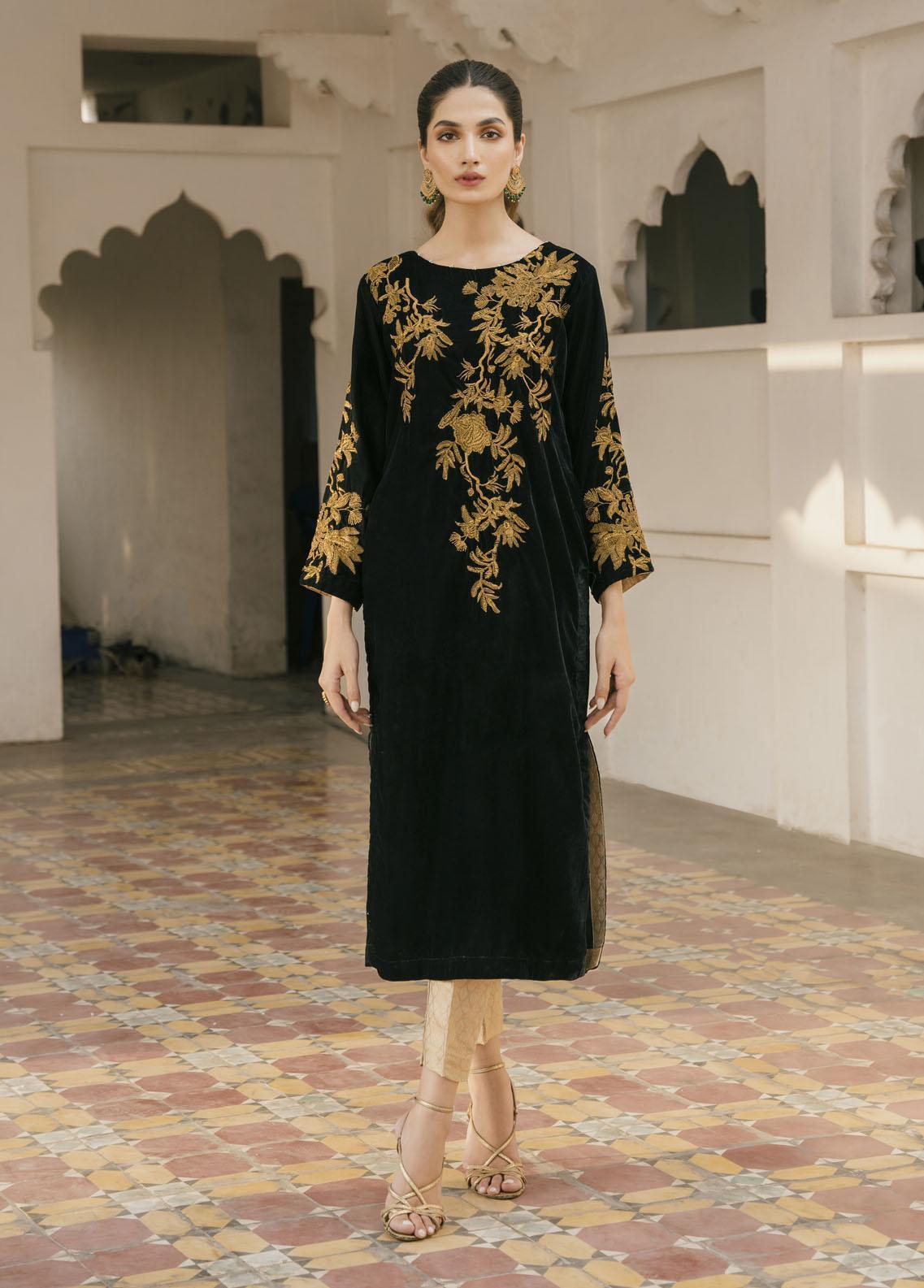 Fabric Its 9000 micro velvet Details Tilla embroidered neckline with embroidered sleeves with modren cut front while paired with jamawar pants Length length is 48-50 for all sizes