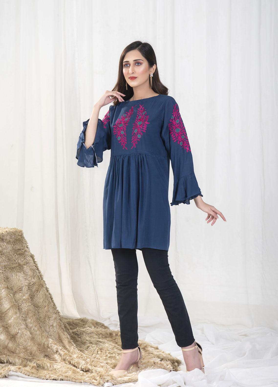Nazmina Pret Casual Boski Top NZ23SSP AB-502 Teal Blue Embroidered