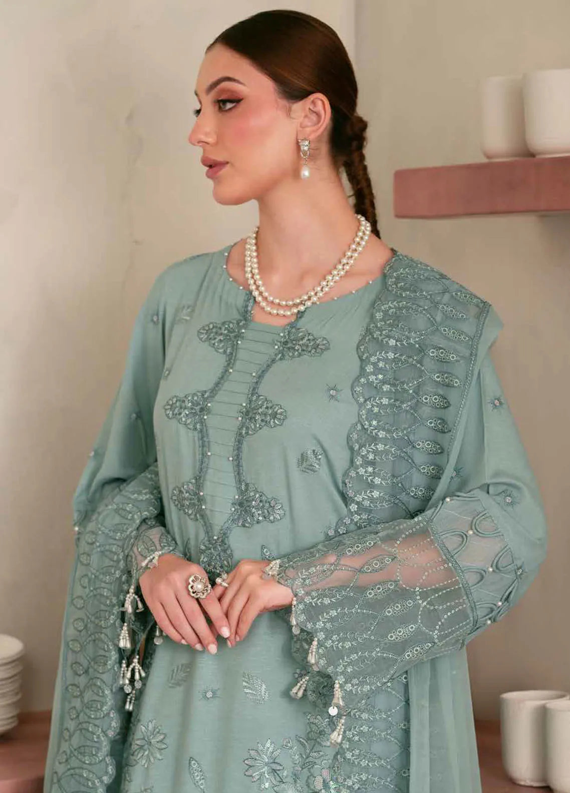 • Embroidered Karandi Shirt, Embroidered Chiffon Dupatta And Dyed Karandi Trouser