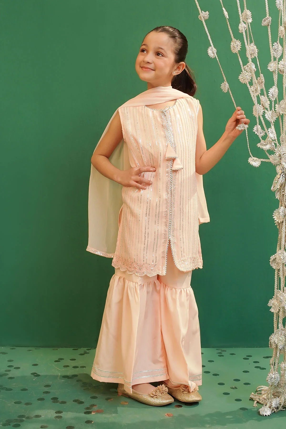 "Top: Peach Chiffon Sequence Embroidered at front with Malai crepe stitched lining