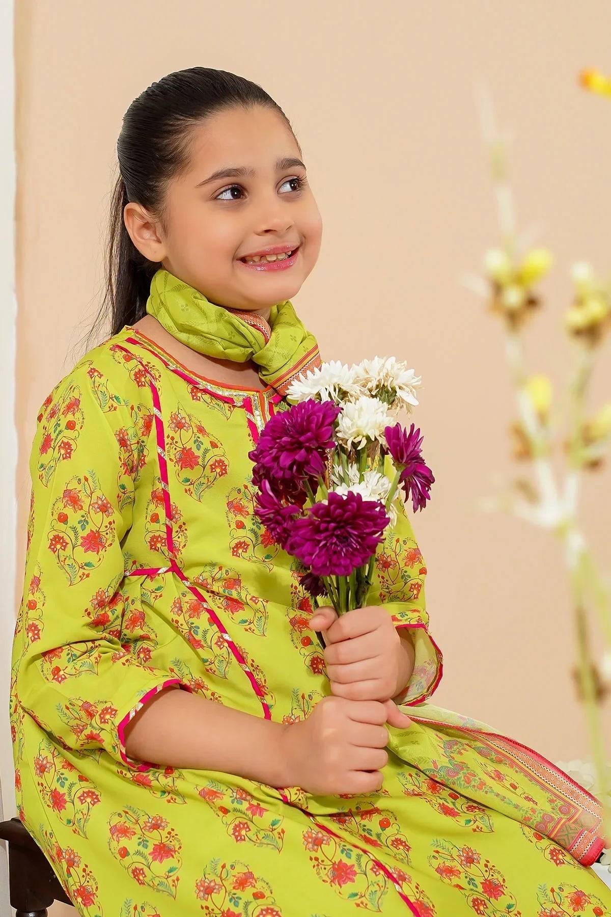 "Top: Parrot Green Swiss Lawn Digital Printed Kurta with Gota Work and Laces