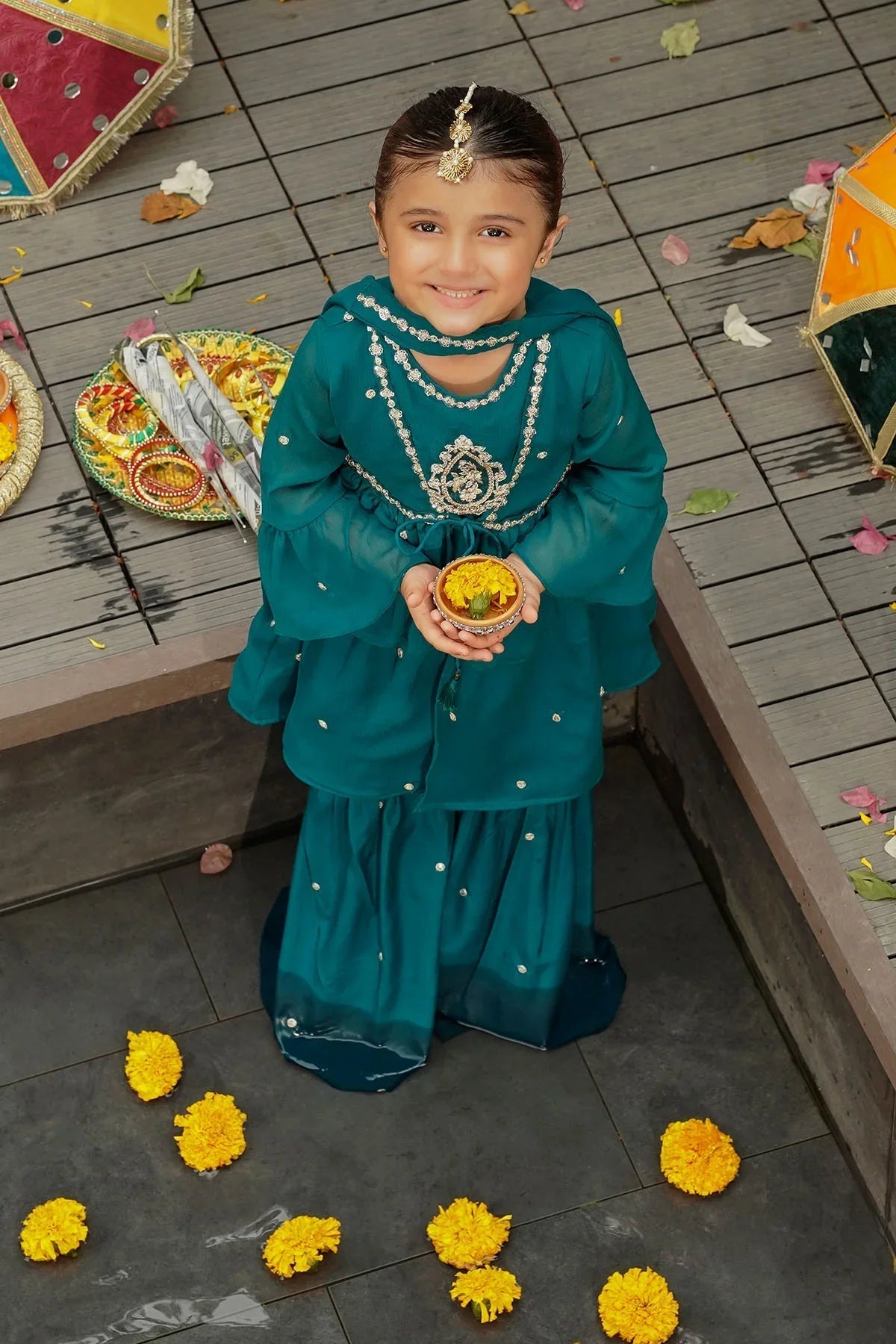 Top: Emerald Green Chiffon Kurta with Embroidery and Malai Crepe Lining