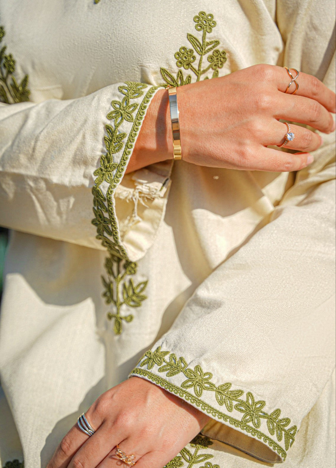 This elegant beige piece features intricate green dorri embroidery that flows beautifully across the fabric, enhanced by a delicate lace finishing. A perfect blend of sophistication and charm, adding a timeless touch to any wardrobe.