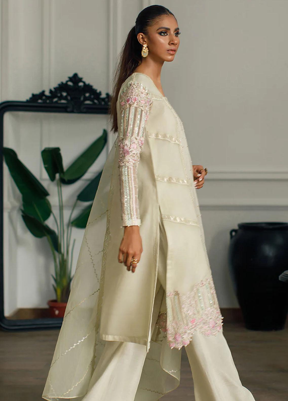Ready-to-wear organza tunic in light yellow shade with v-shaped neckline ornamented with mirror and golden zari work.The tunic is decorated with pearls, stones and gota work. Sleeves and cutwork is embroidered in botanical thread and zari patterns enhanced with sequins and pearl edgings for a sophisticated and an elegant look