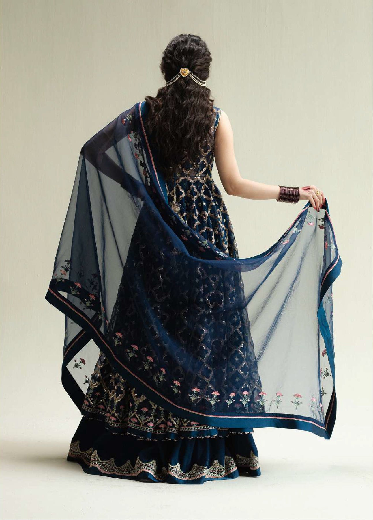 A regal blue organza Anarkali adorned with delicate all-over embroidery, highlighted with subtle sequin accents for a gentle shimmer. The silhouette is finished with a wide silk border, accented with soft pink motifs for a refined contrast. It is paired with a Korean silk lehenga embroidered along the hem.