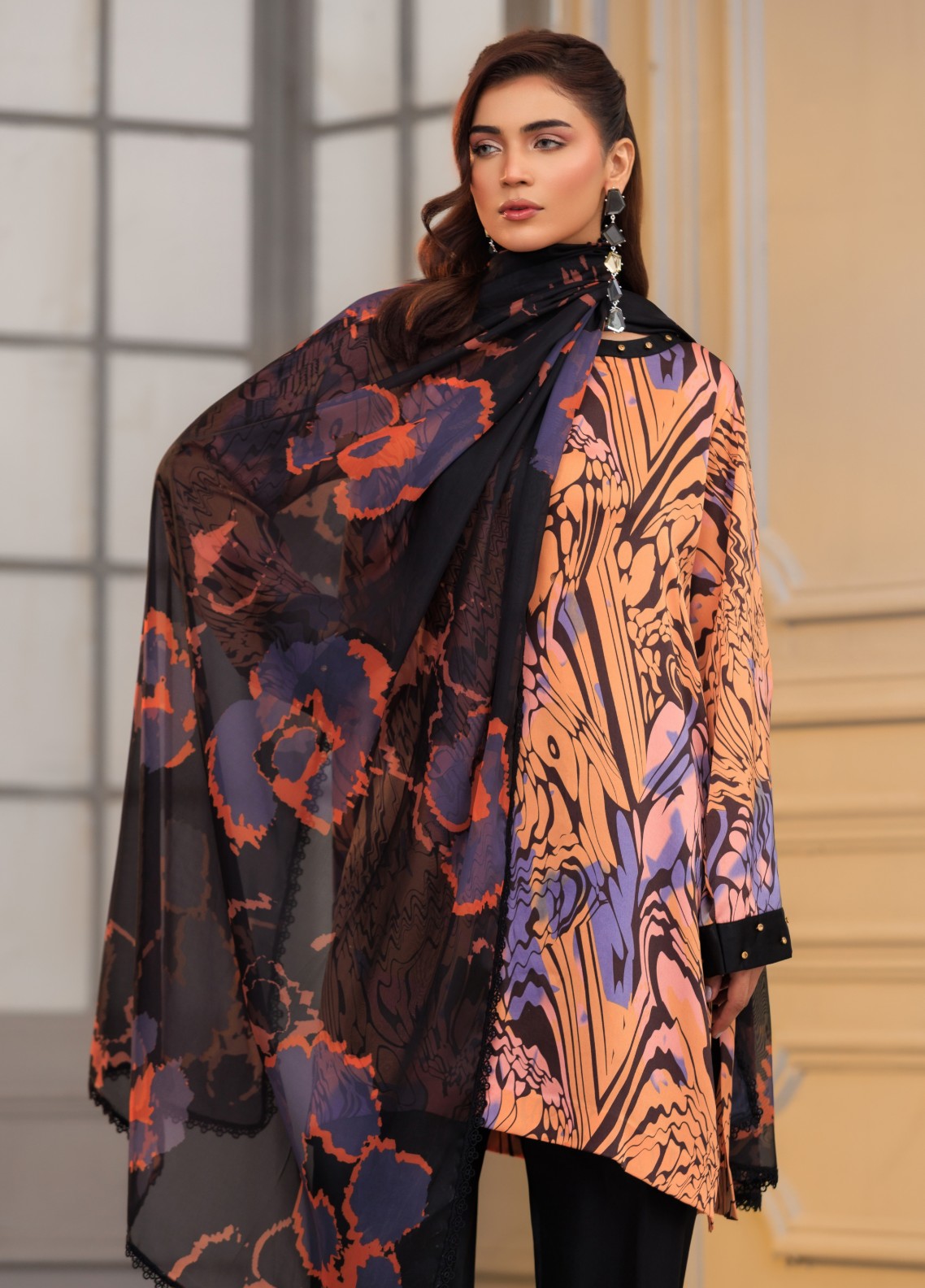 The Naqsh 3-piece sublimation silk outfit blends bold artistry with modern elegance, featuring a striking sublimation printed silk shirt, a statement silk dupatta, and classic silk trousers for effortless sophistication.