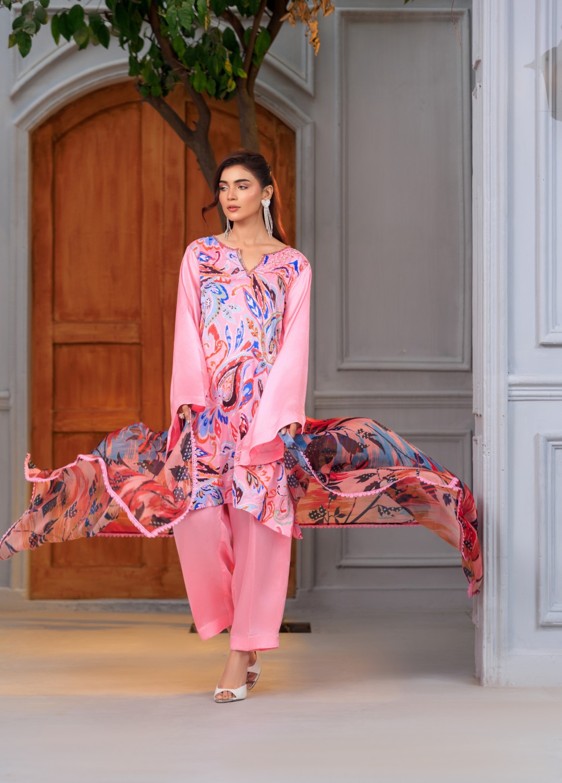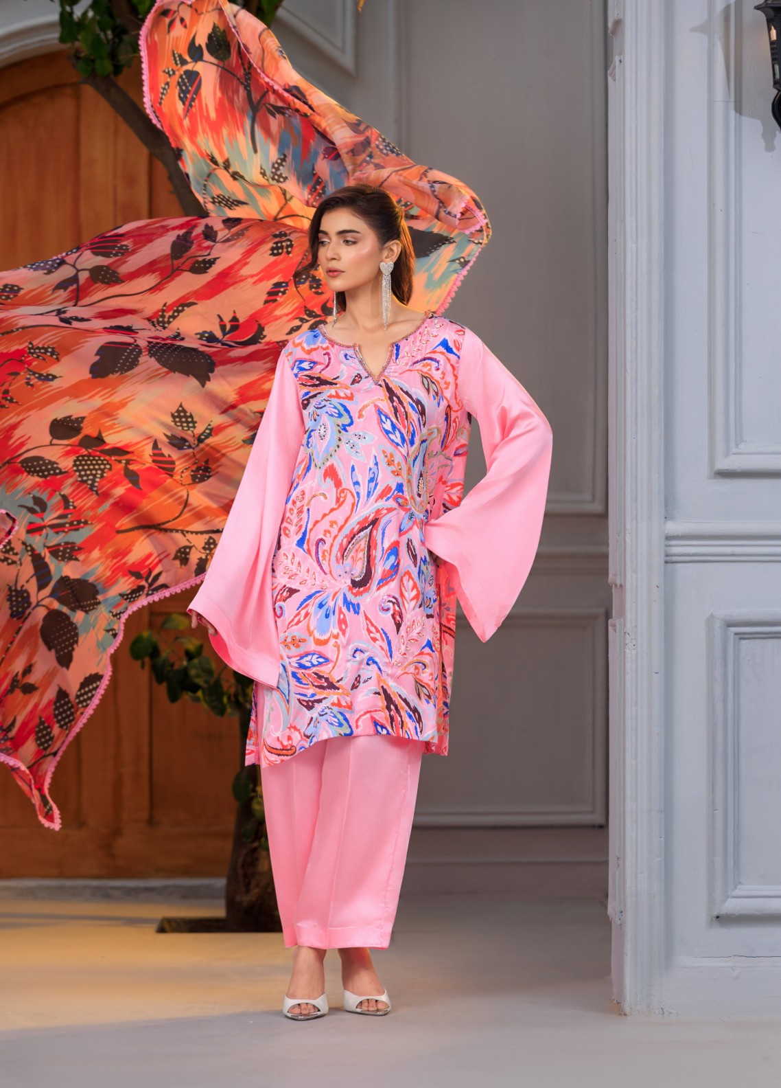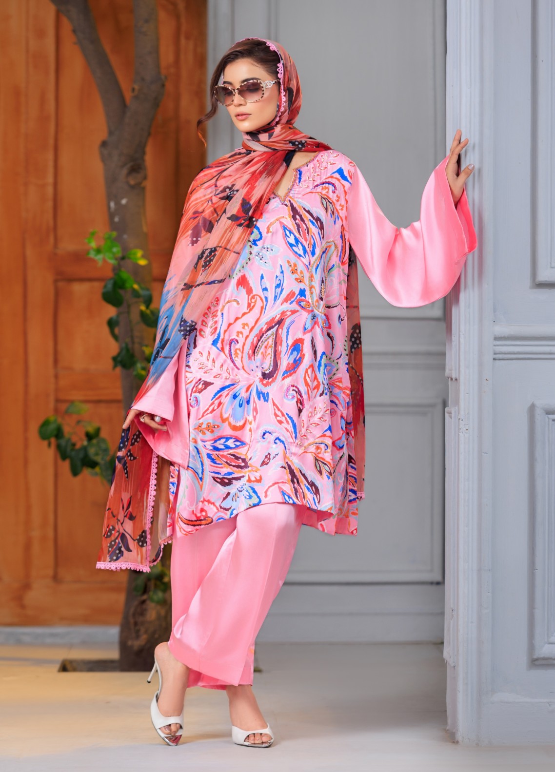 The Izza 3-piece sublimation silk outfit features a vibrant printed silk shirt, a flowing large scale printed silk dupatta, and matching solid silk trousers for luxurious comfort.