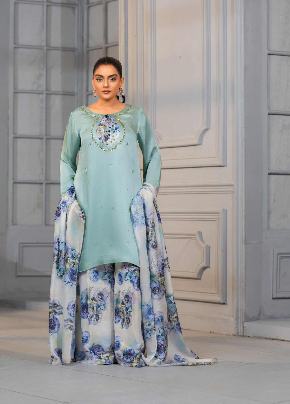 The Sahar 3-piece sublimation silk ensemble showcases a radiant paisley-themed shirt and coordinated silk trousers, offering a sophisticated blend of modern artistry and luxurious comfort for the 2026 season.
