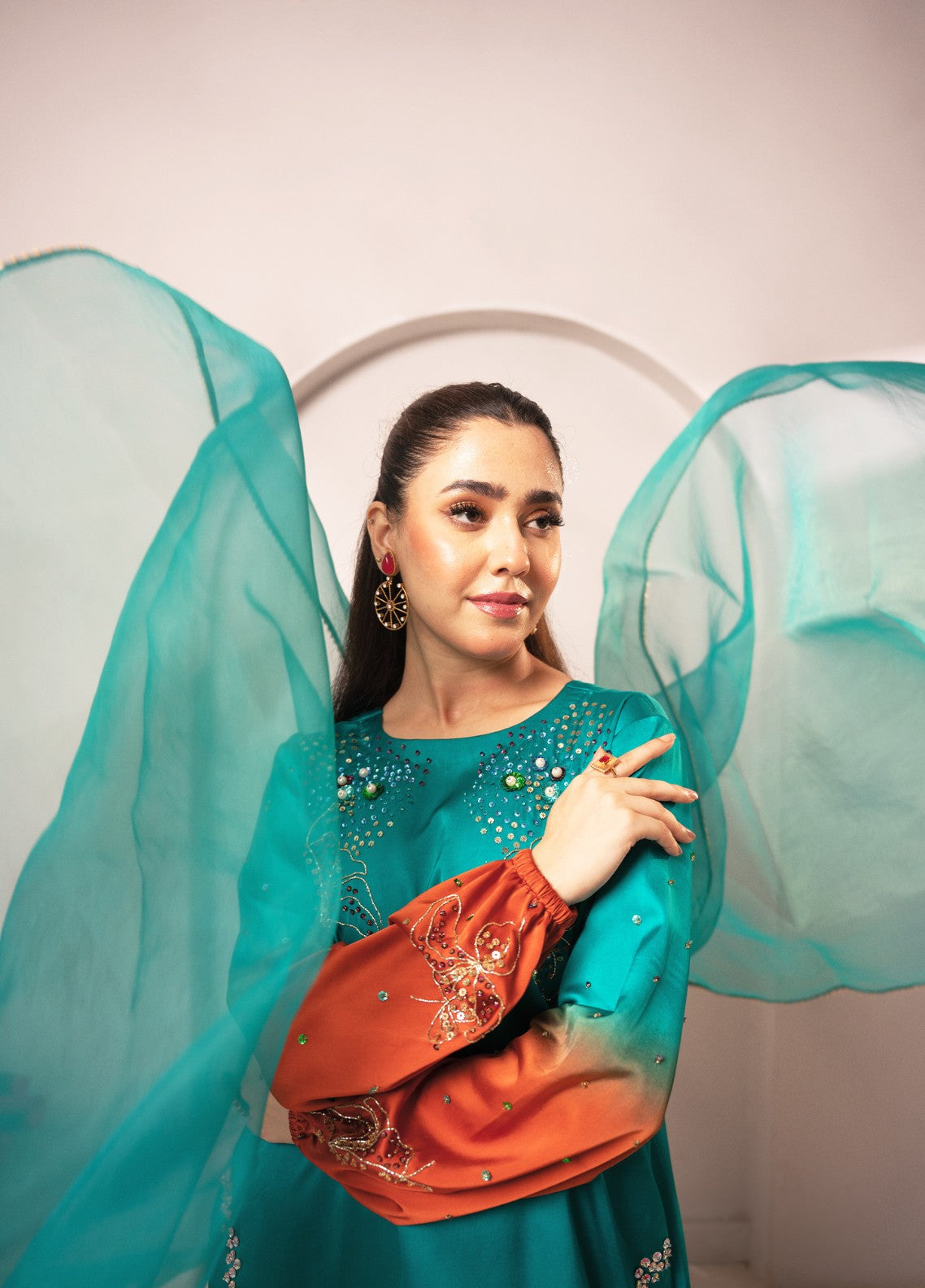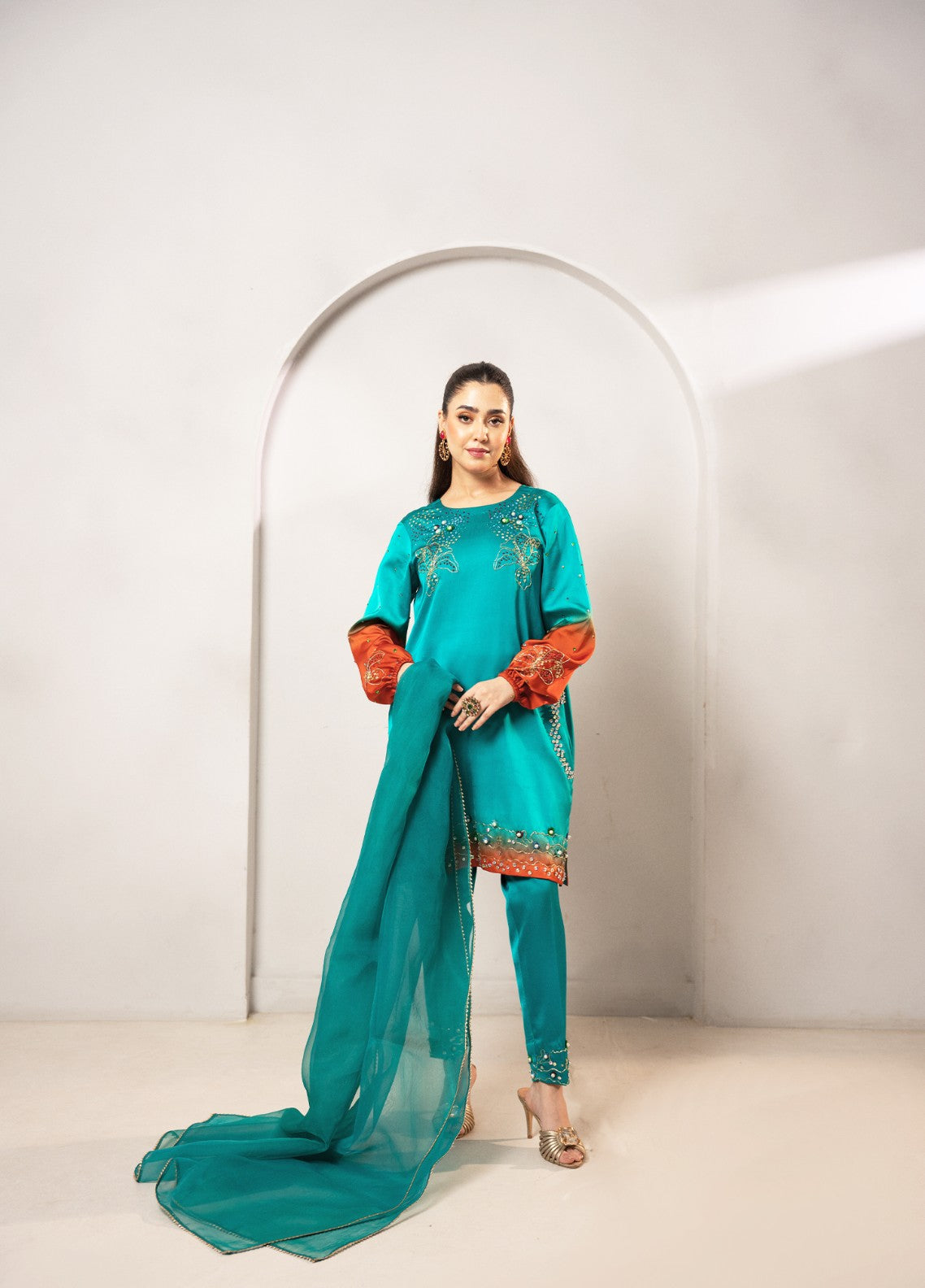 Make a refined style statement with this striking 3-piece Muse Touch Shamooz Silk ensemble, featuring a beautiful two-tone palette of sea green and burnt orange. The luxuriously soft shamooz silk fabric lends a natural sheen and graceful drape, while subtle embellishments add texture and a hint of sparkle to the richly designed shirt. Paired with a coordinated trouser in the same luxe fabric, the outfit maintains a sleek and elegant silhouette. A plain matching dupatta balances the overall look, letting the two-tone contrast and embellishment work shine without overwhelming the ensemble. Perfect for festive gatherings, semi-formal events, or elegant daywear — this outfit captures the essence of modern tradition with a bold yet graceful flair.