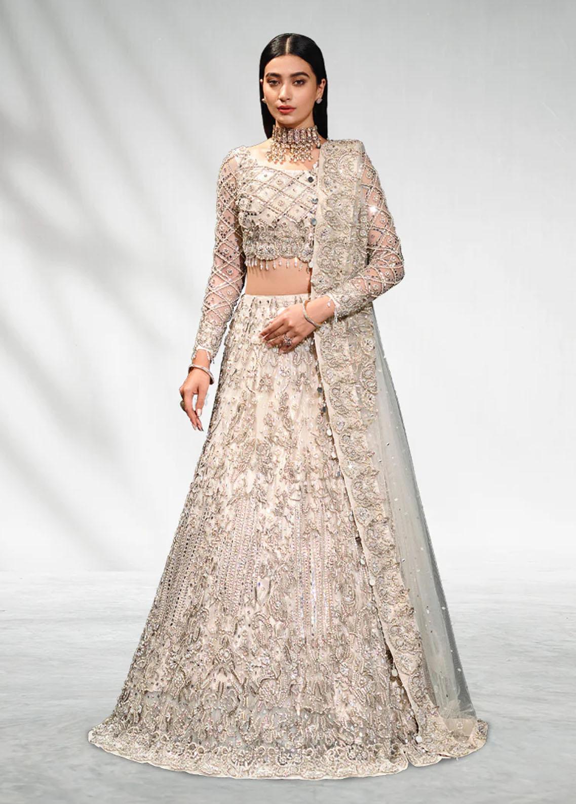 Bringing to life the quintessential magic this bridal pairs along with net blouse and lehenga heavily embellished with crystals pearls and sequins. The amalgamation of ivory and silver with a traditional silhouette gives a forever glamorous vibe. The geometrical and floral fusion of handwork pattern makes it modern and classy. The dupatta borders are beautifully embellished with spray of hand embellishments all over to give it a delicate finish. This grand outfit from Malook makes an opulent statement.Includes Lehenga Choli and Dupatta. Fabric Net Color White Ivory