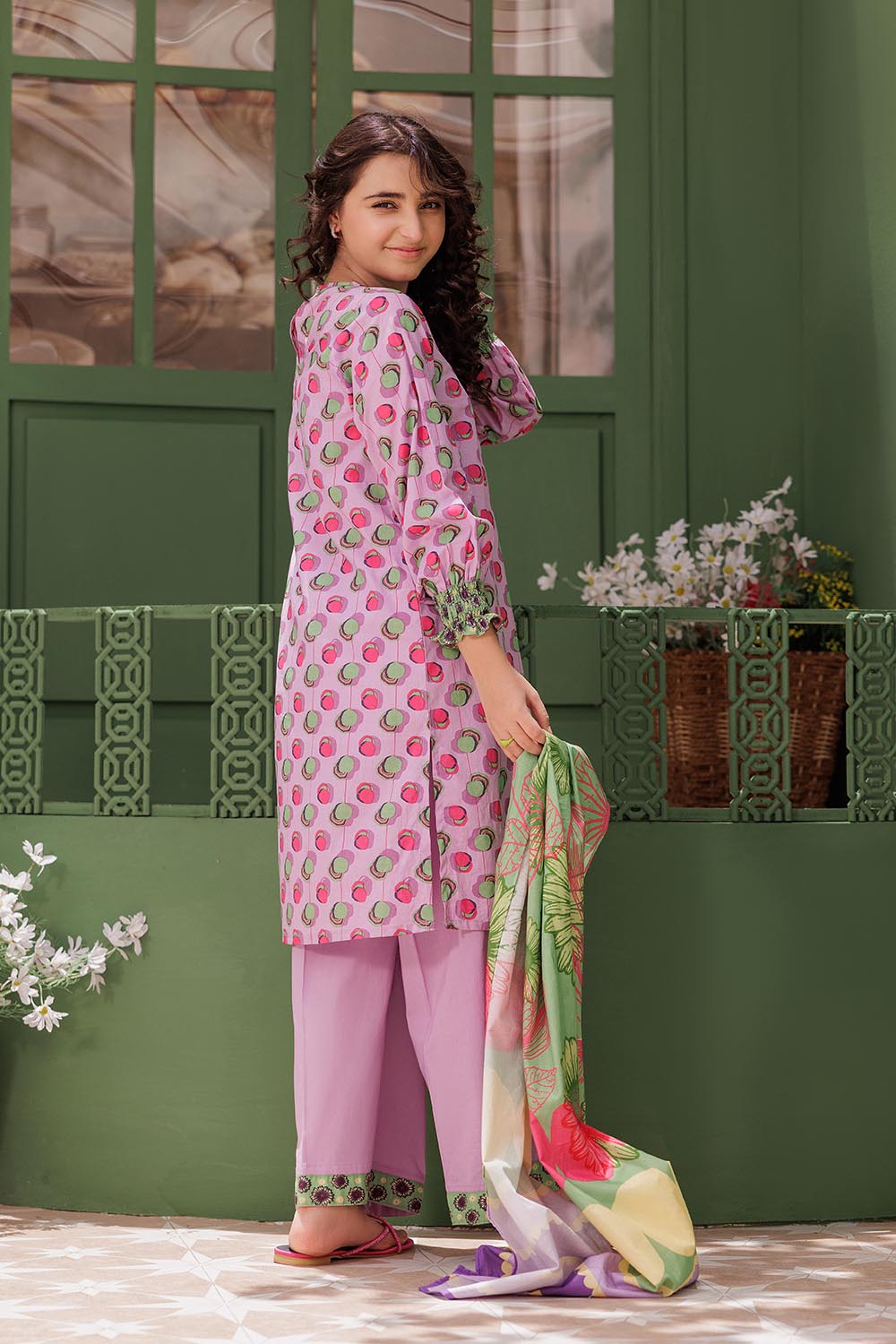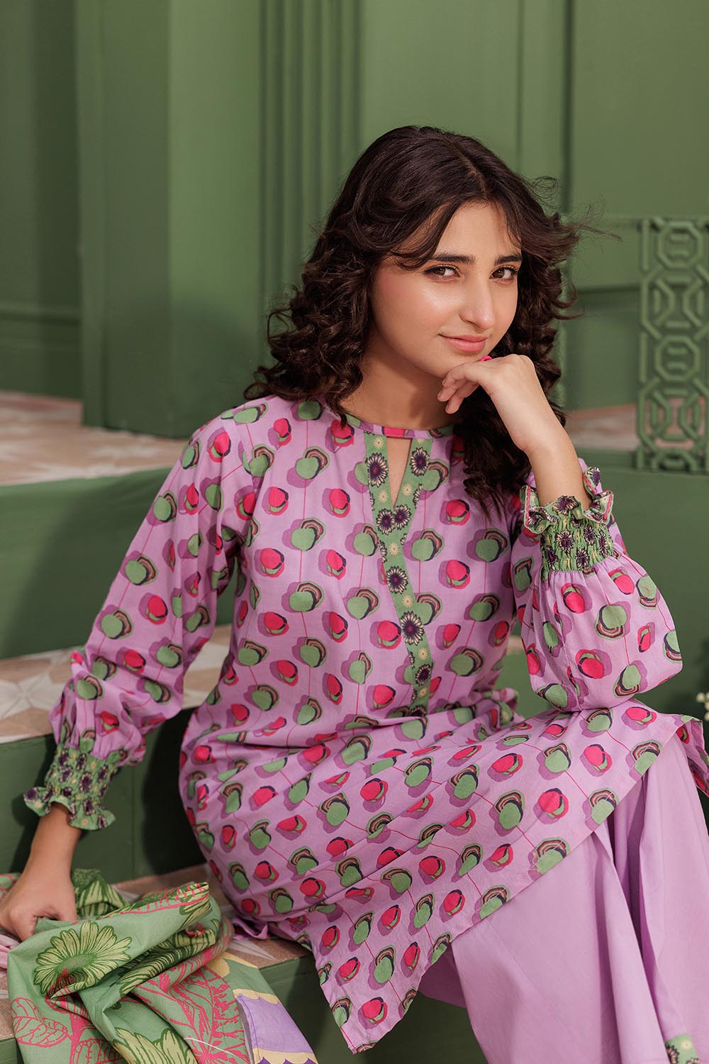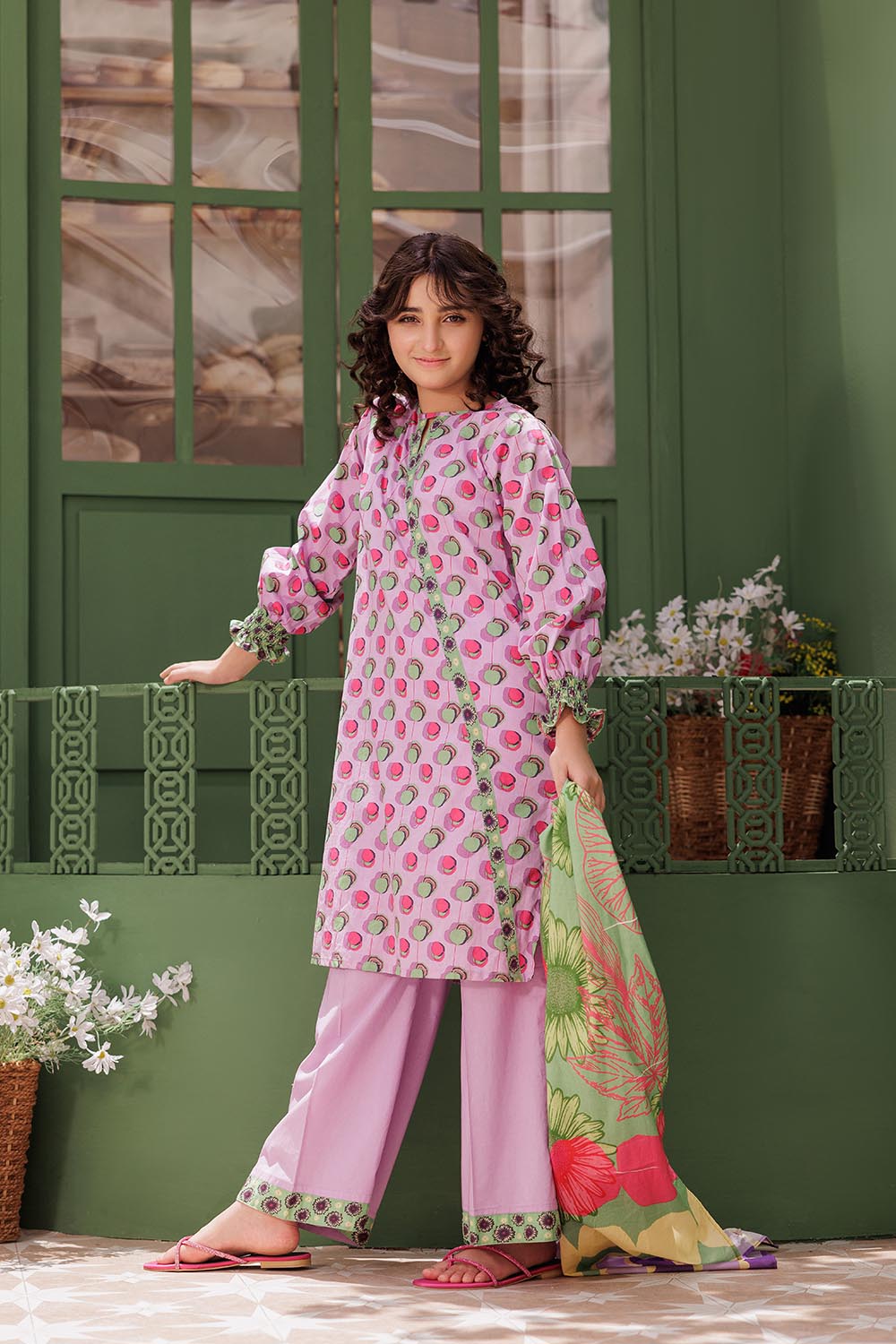 Angarkha style shirt with smocking cuff sleeves paired with loose cut pants and printed duppatta.