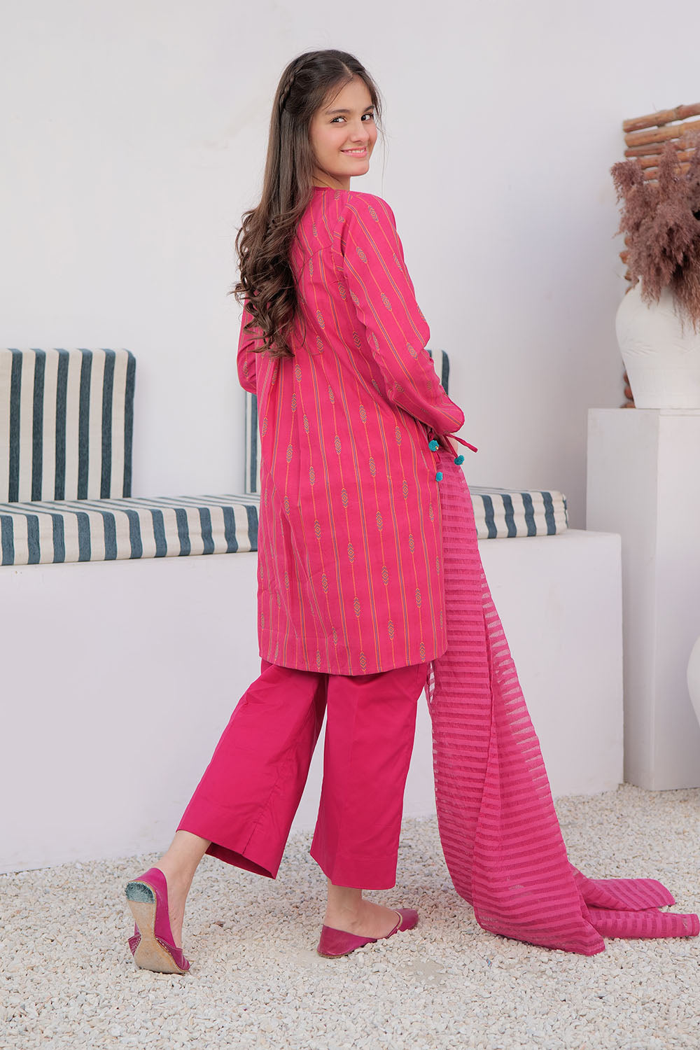 Stylish body pleated shirt. Embellished with poms poms and playful dori. Paired with straight pants and dupatta.