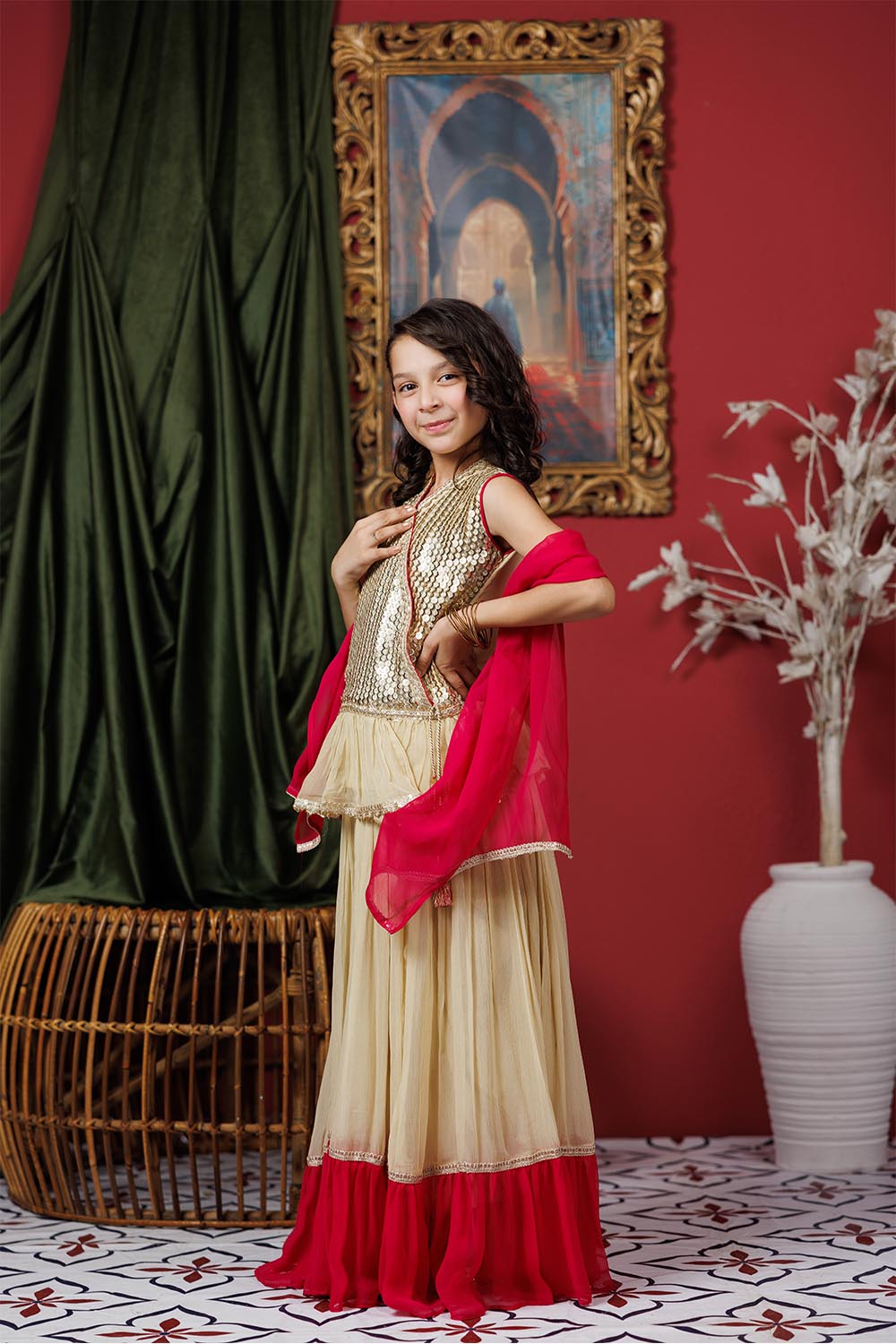Stunning kids formal clothes featuring an angarkha style shirt with heavy embroidery, finished with a wide frill on the daman and a stylish tassel on the side.