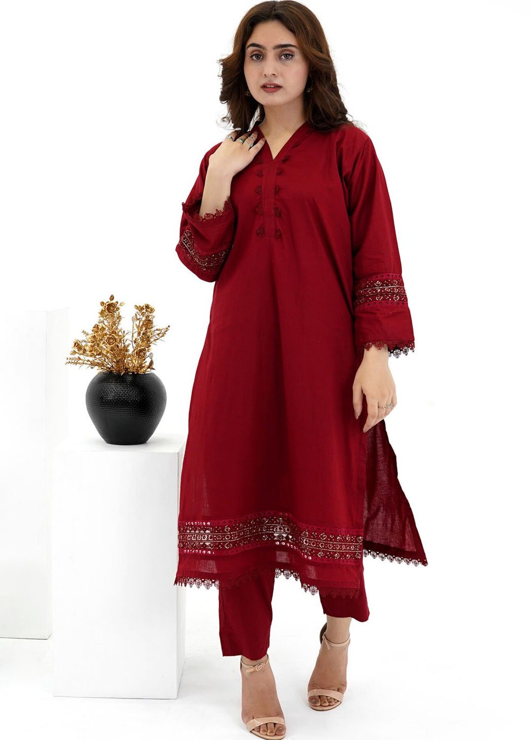 Pret Bee Women Cotton Embroidered Suits 2 Piece Vibrant Red - Winter Collection
