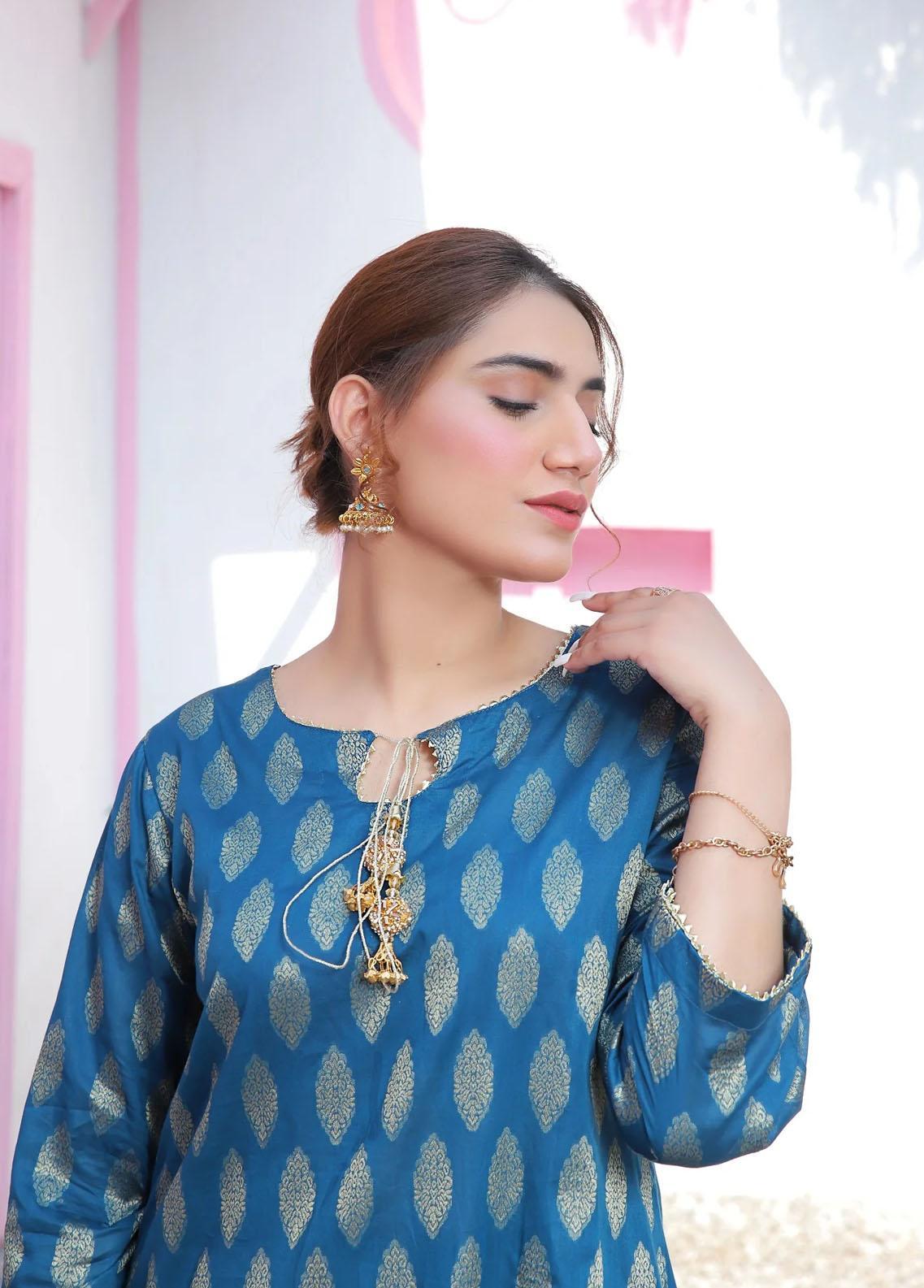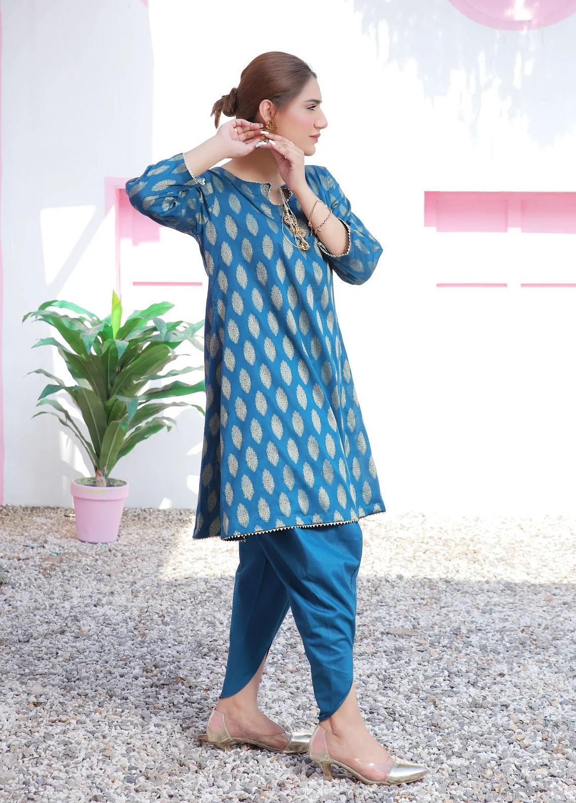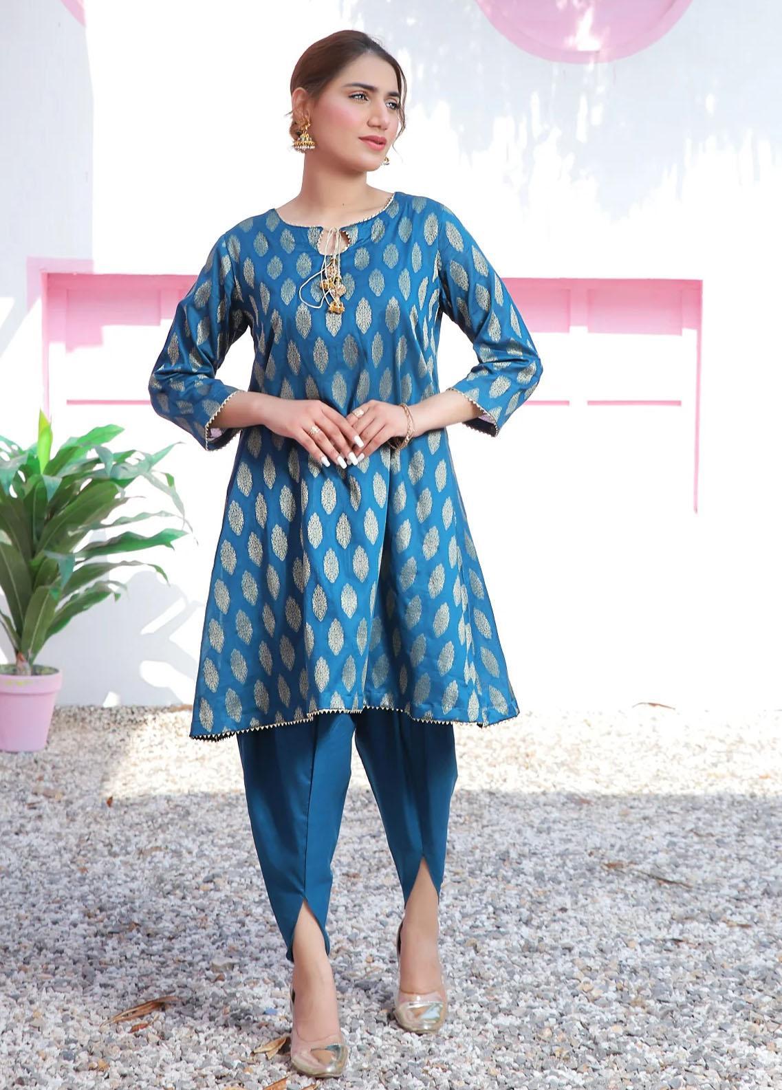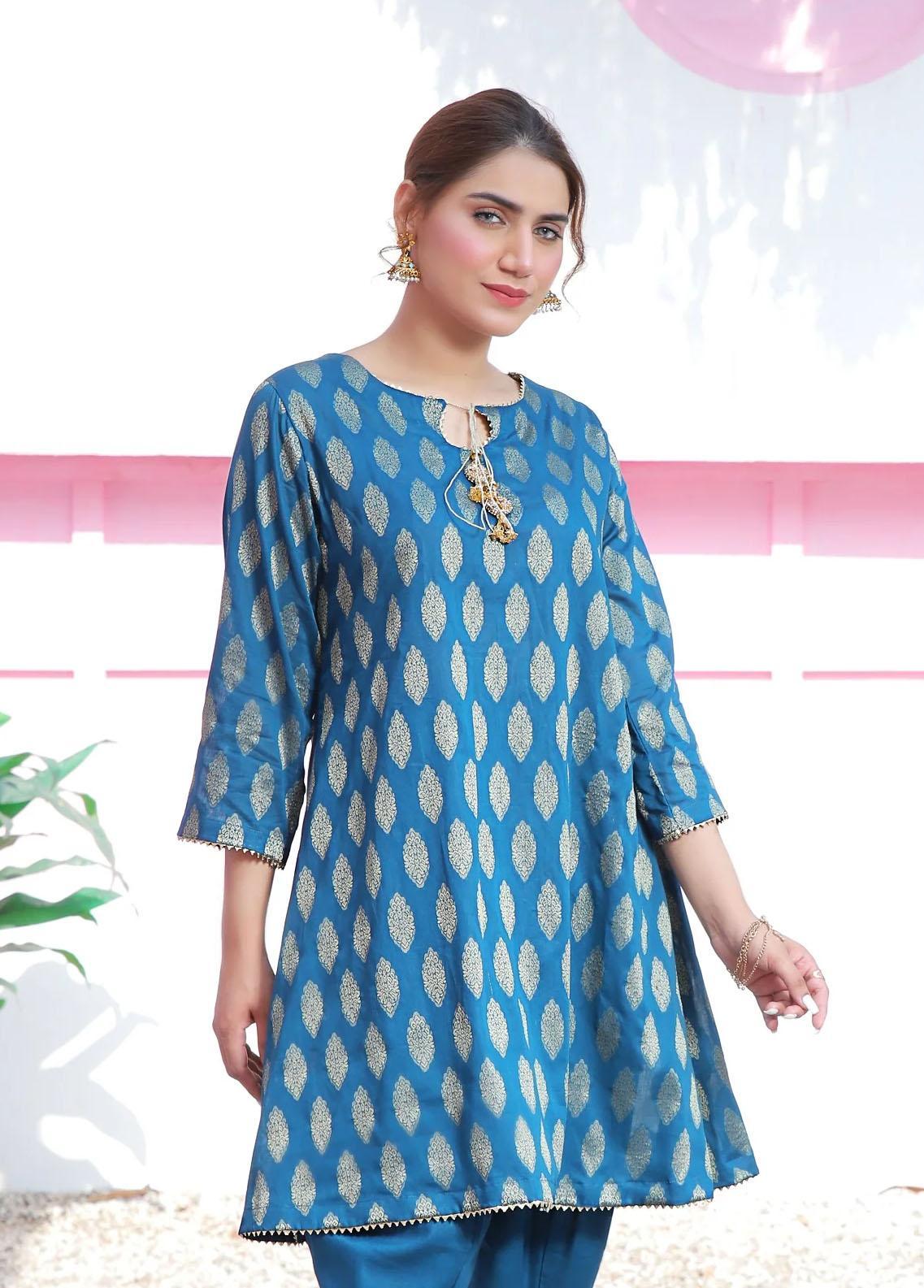 TOP: A line cotton jacquard shirt paired with tassels and gota lacing on neck sleeves and daman. BOTTOM: Cotton tulip shalwar.