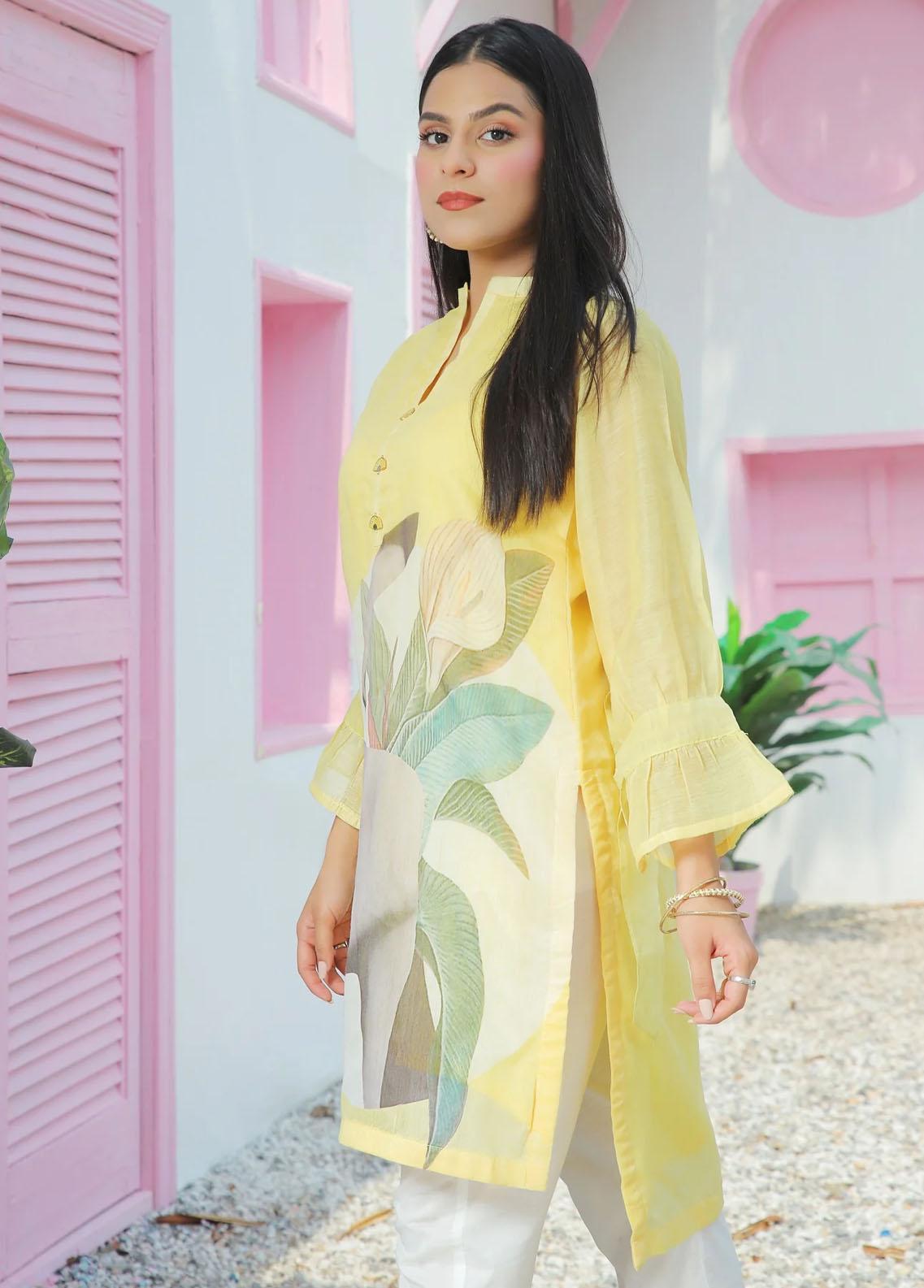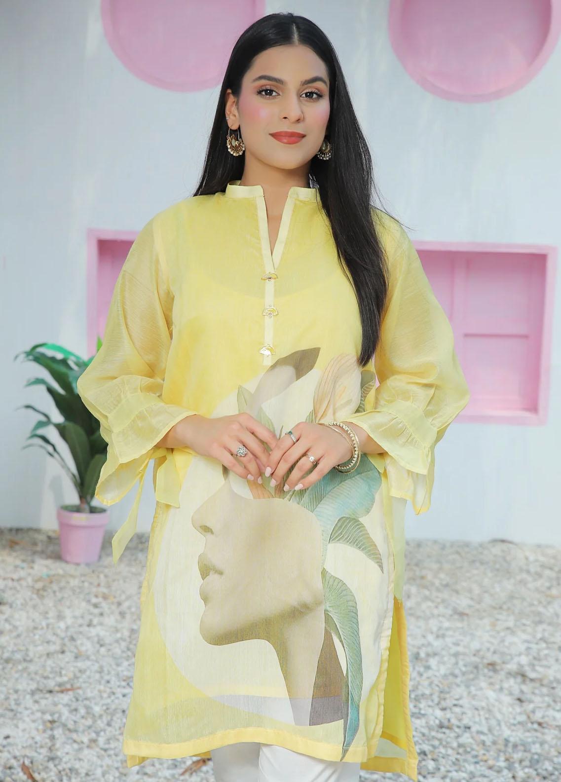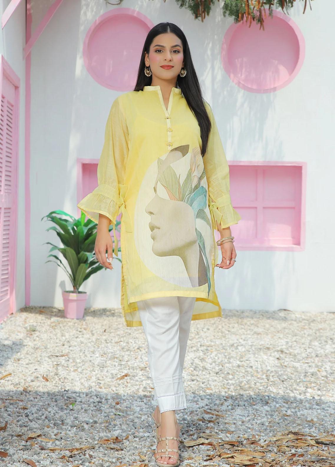 Digital printed light weight paper cotton kurti designed with umbrella sleeves and embellishment on neck line.