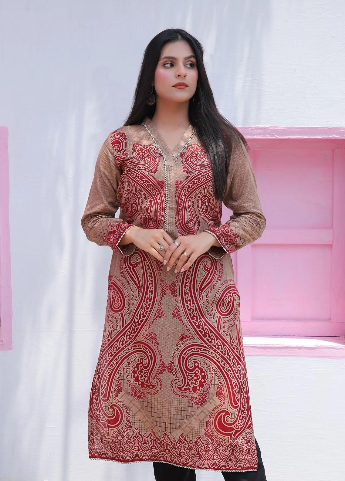 Digital printed lawn kurti with gold gota kinari lace on neckline sleeve and daman.