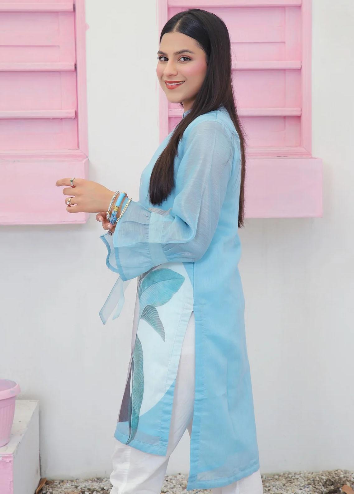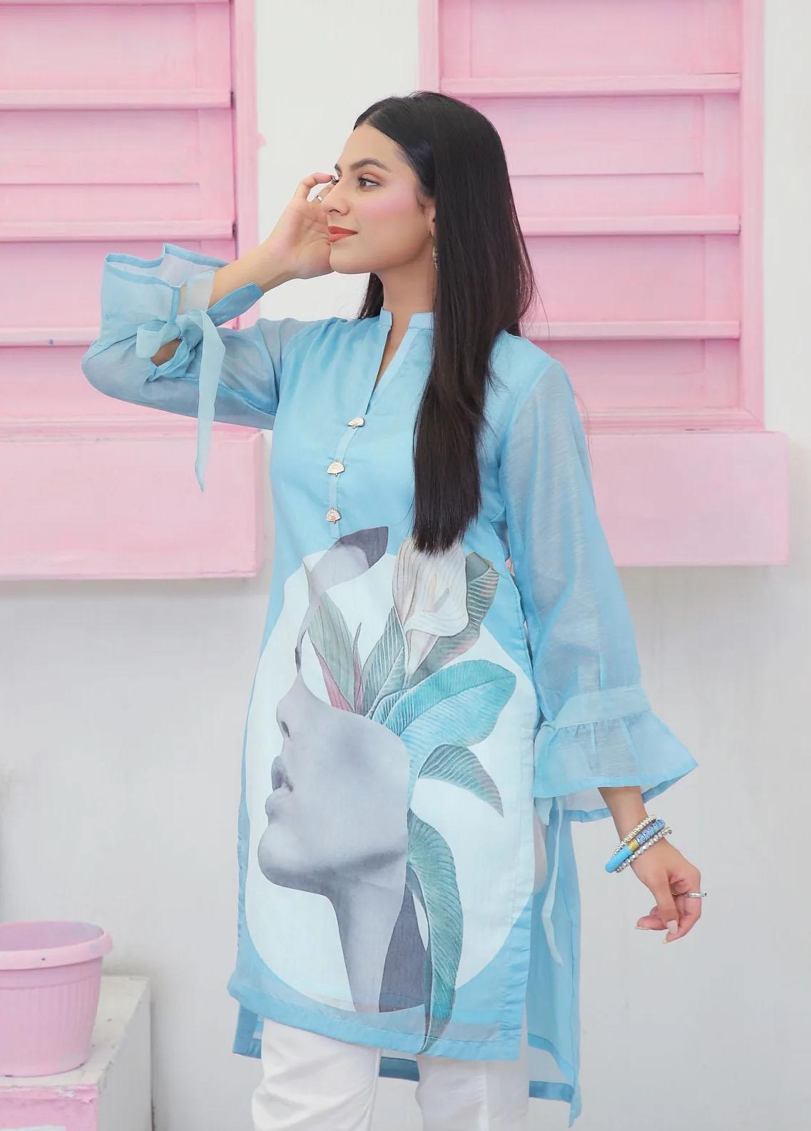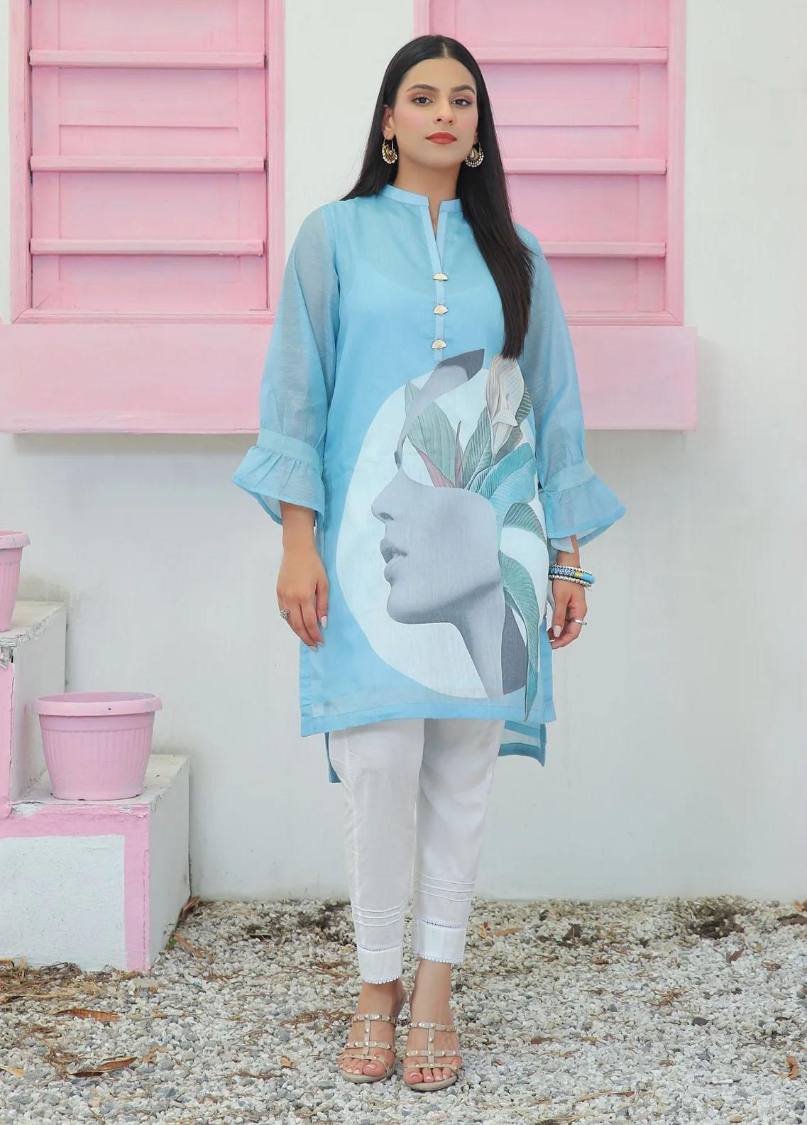 Digital printed light weight paper cotton kurti designed with umbrella sleeves and embellishment on neck line.
