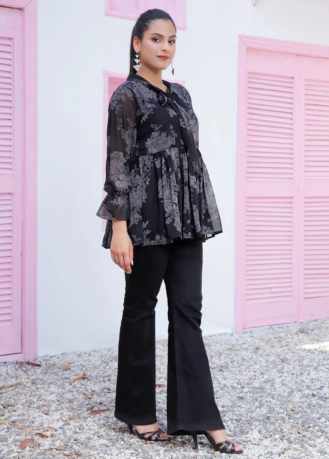 Printed chiffon top designed with bow on neckline and umbrella sleeves.