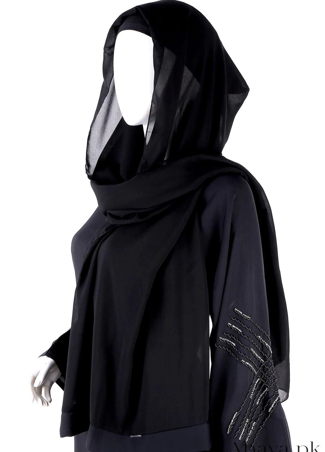 Product description: A gorgeous black abaya with intricate details of crisscross black handwork and a touch of white cut-dana on the sleeves and bottom, making your style modest and elegant.