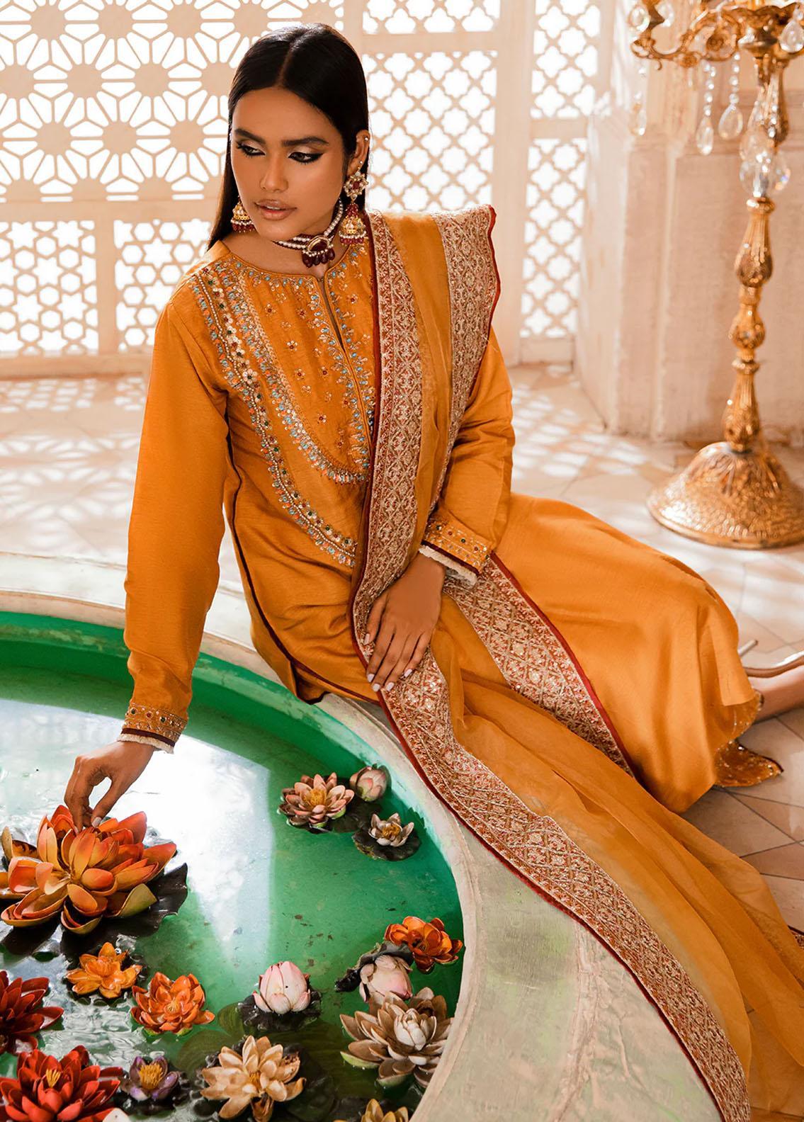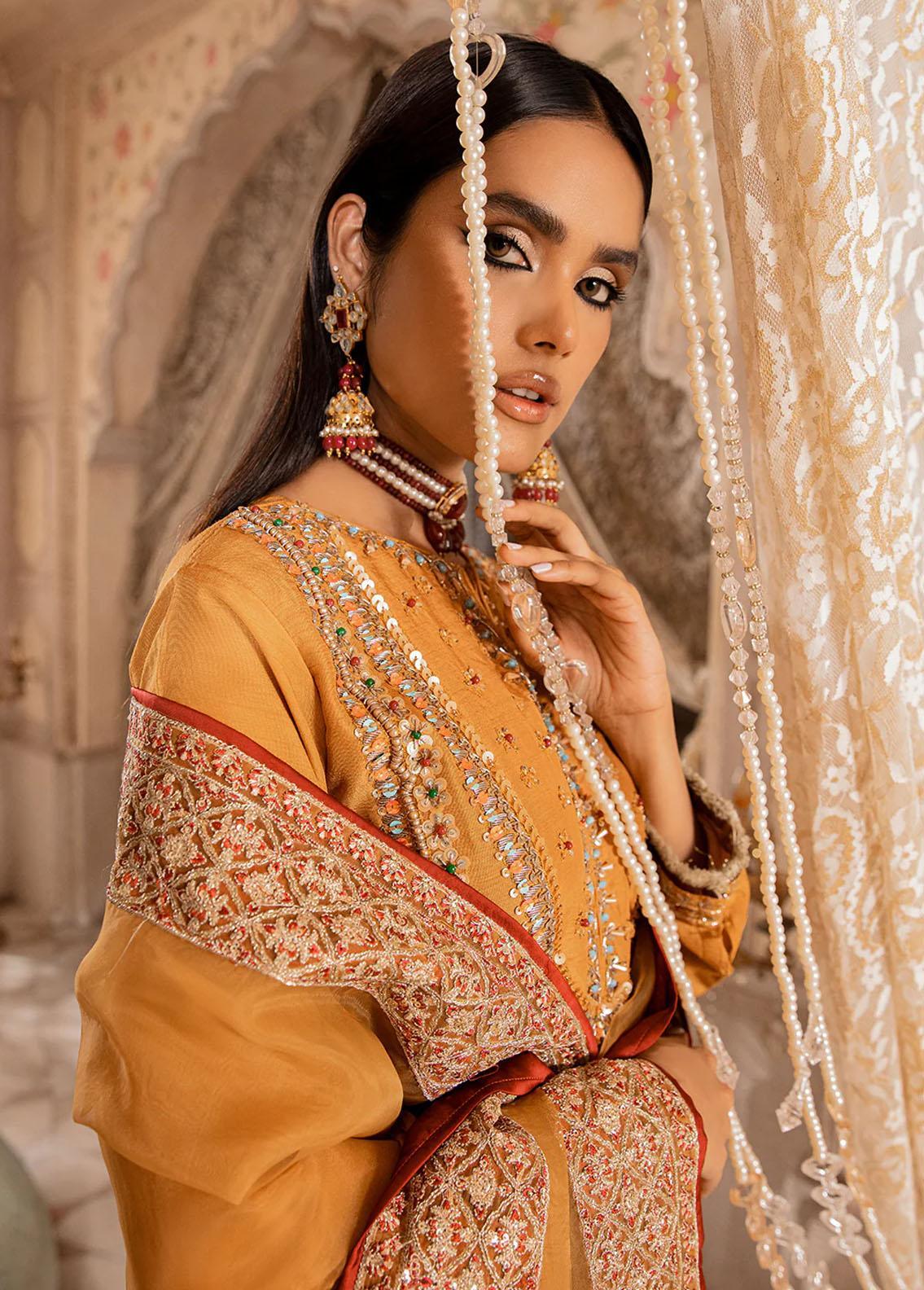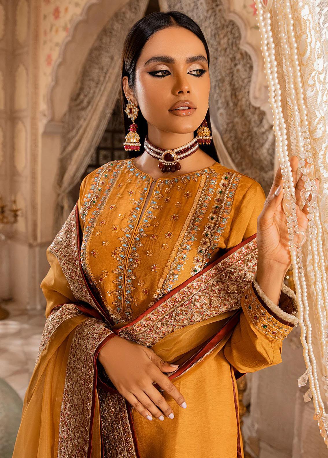 Featuring A Modern Yet Traditional Look. Mushk Consists Of A Korean Raw Silk Canvas For The Shirt That Is Delicately Embellished With Crystals Dabka Cutdana And Pearls. Paired Along With An Embellished Pants And An Embroidered Organza Dupatta