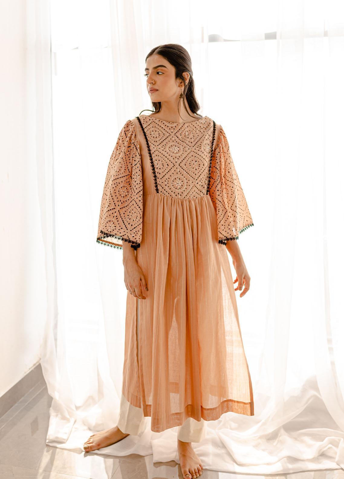 Flared shirt with straight cut neckline and block printed panel in neckline and sleeves.