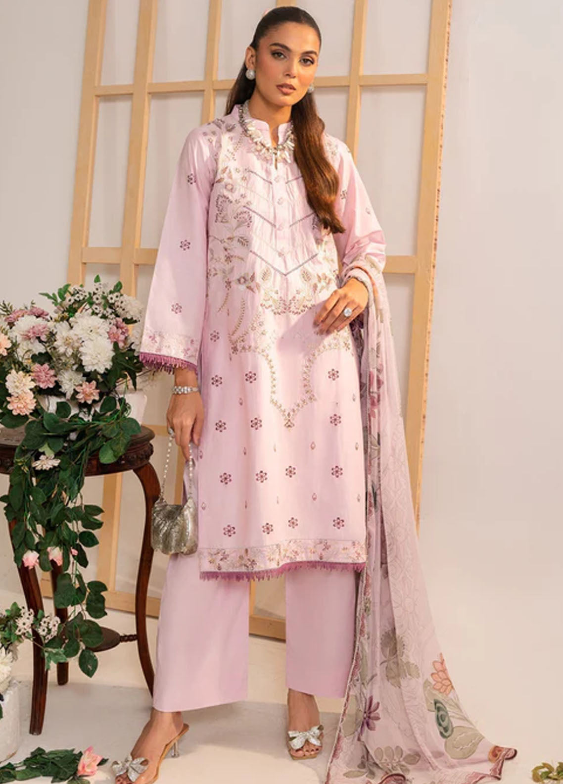 3 PC stitched set featuring .Solid embroidered shirt .Solid embroidered sleeves .Digital printed chiffon dupatta .Dyed cotton trouser