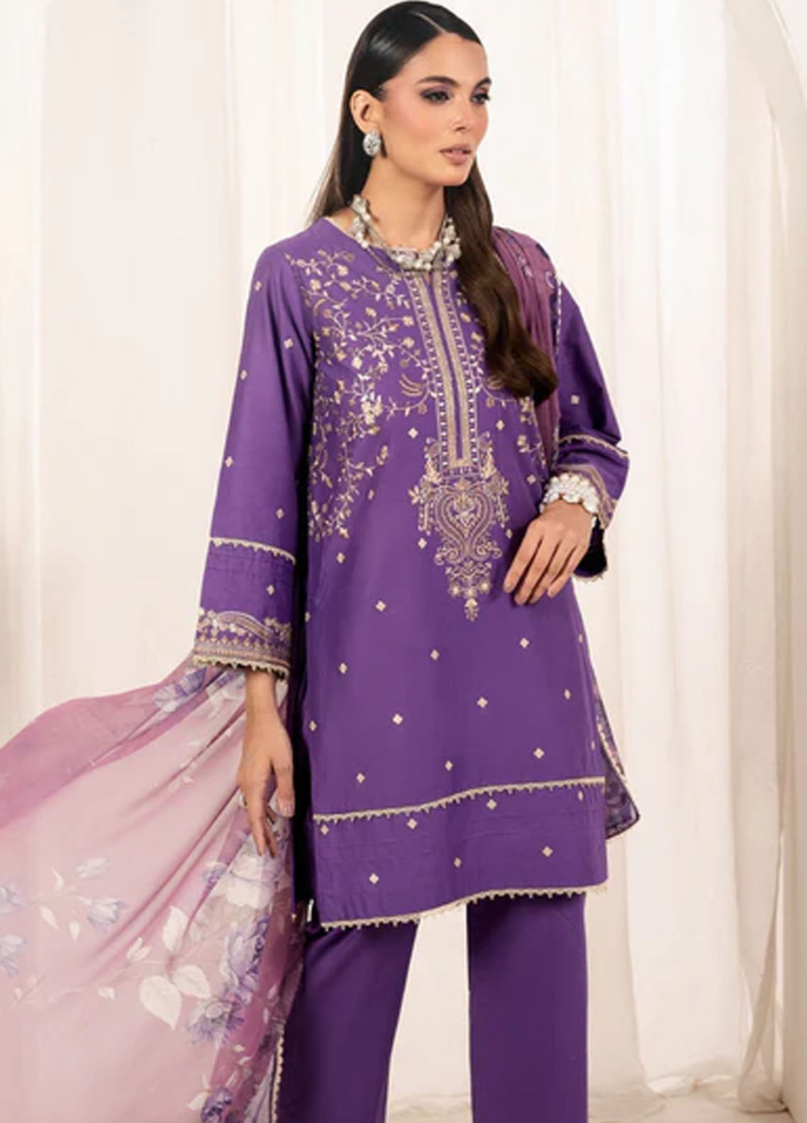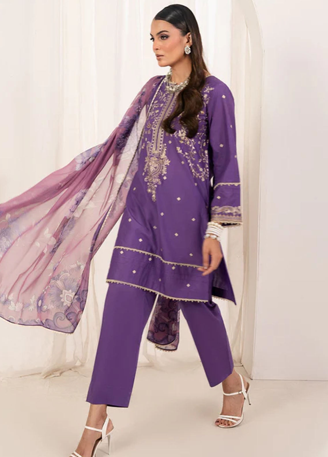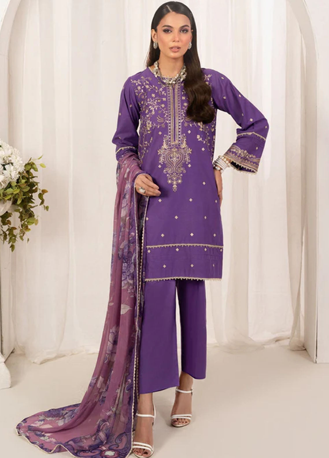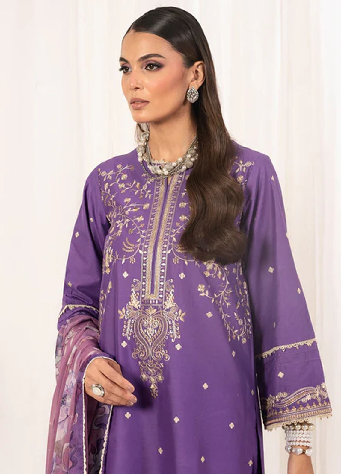 3 PC stitched set featuring .Solid embroidered shirt .Solid embroidered sleeves .Digital printed chiffon dupatta .Dyed cotton trouser