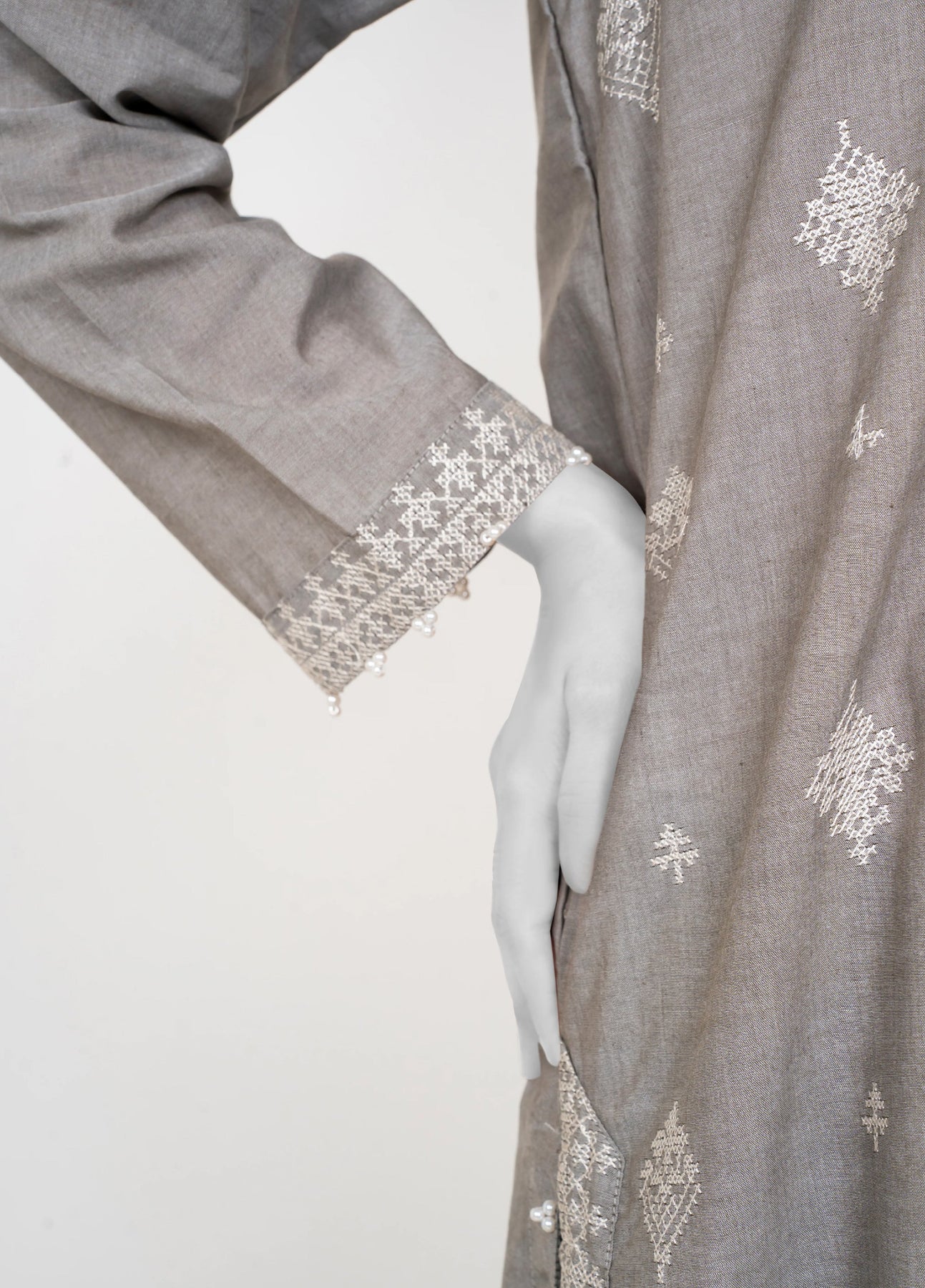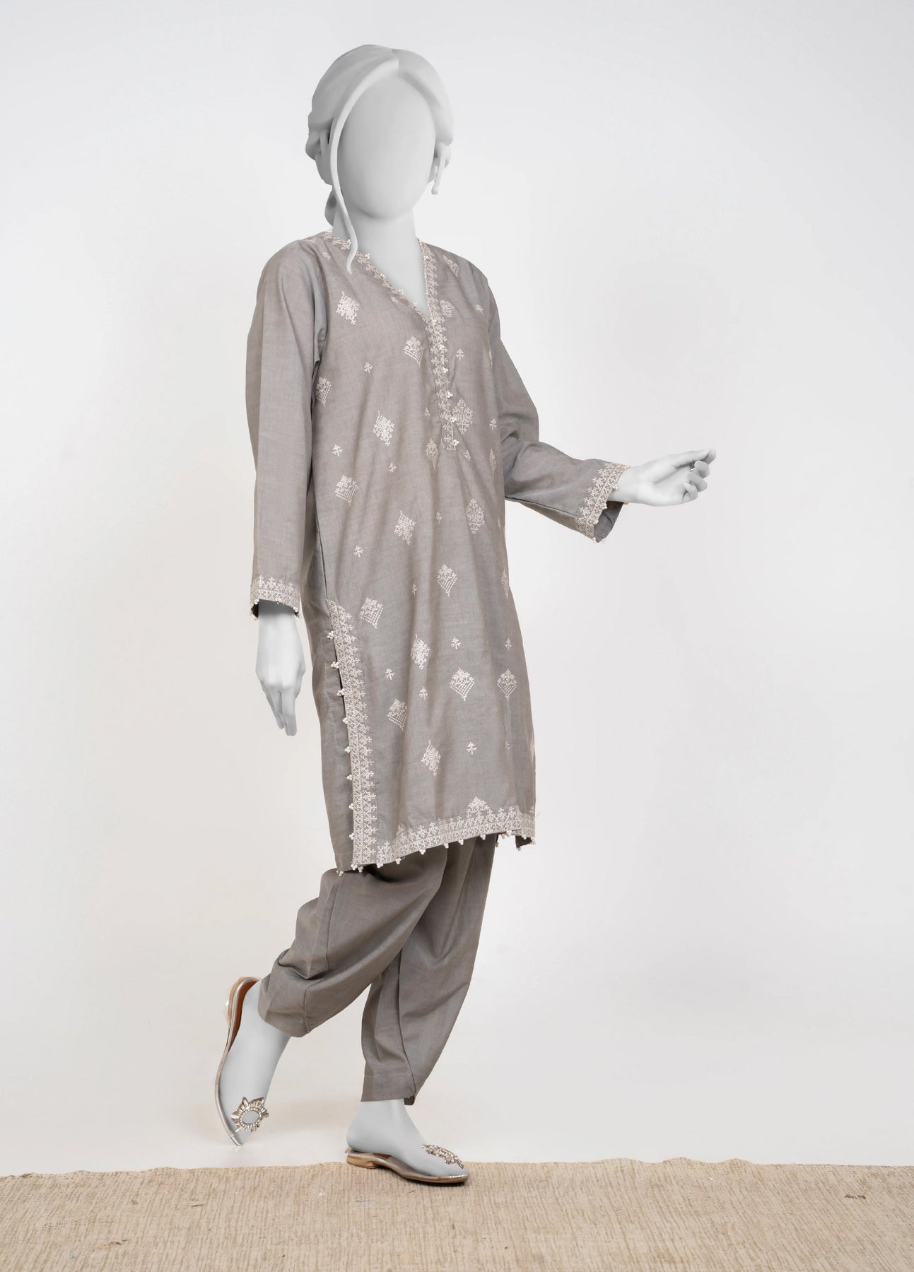 Embrace the Chambray Winters 2025 collection with this elegant Silver Grey 2-piece set featuring solid embroidery that adds refined texture and charm. Paired with tulip-shaped trousers, it offers a fresh and graceful silhouette perfect for stylish winter wear. This ensemble blends comfort and sophistication, making it an ideal choice for those seeking understated elegance with a modern touch.