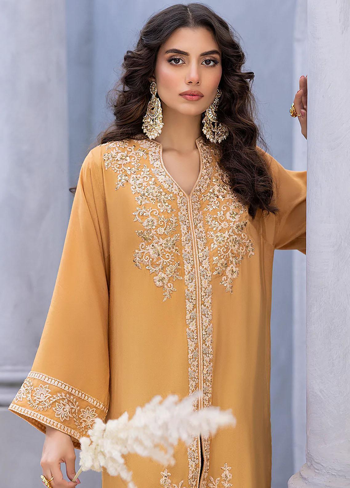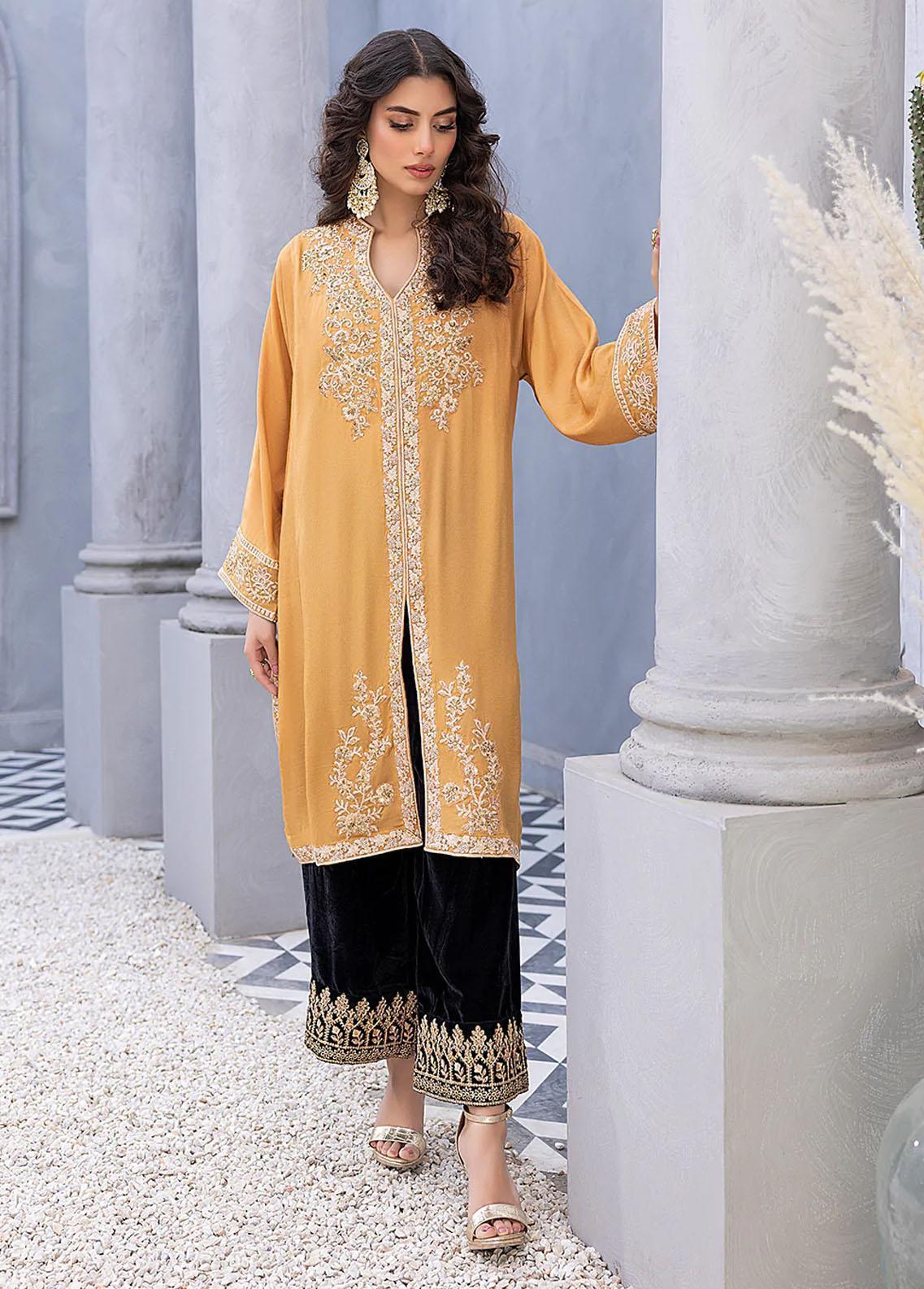 Chantelle is a mesmerizing work of perfection. The enchanting raw silk front open shirt is induced in a stunning mustard hue. The front and sleeves are uplifted by gleaming floral embroidery and exquisite handwork of kora, dabka, naqshi, and sequins done by the finest artisans. It is paired with deep black velvet izaar pants embellished at the bottom to exuberating an aura of finesse, luxury, and opulence