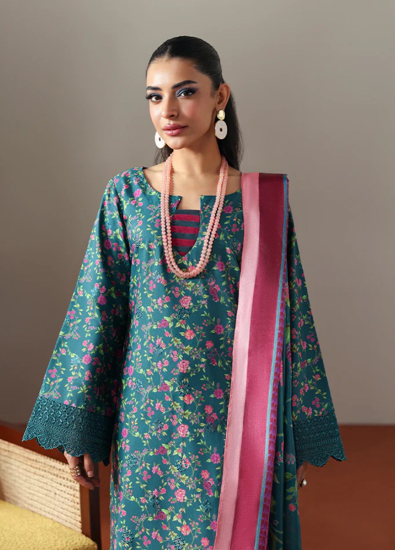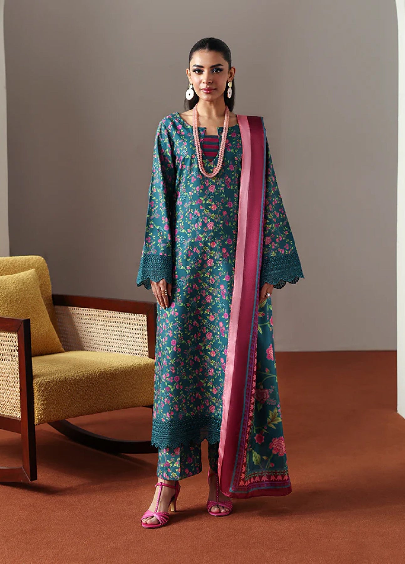 Zeirin is a refined expression of understated elegance, rendered in a rich teal hue on soft poly lawn fabric. The shirt features an all-over floral print, delicately uplifted with subtle chikankari-style embroidery on the front, adding texture and charm without overpowering the design. Embroidered organza borders on the sleeves and front enhance the overall sophistication, while the matching printed trouser maintains a seamless look. A fluid printed silk dupatta completes the ensemble, offering a graceful finish perfect for elevated everyday wear.