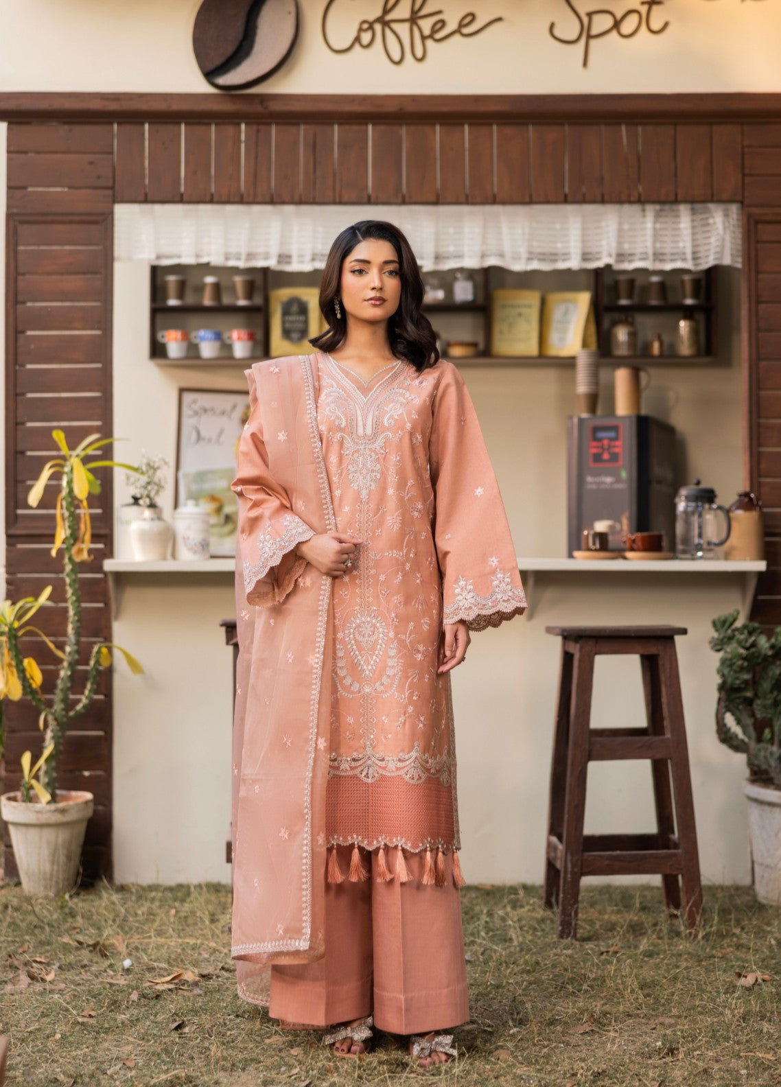 Embroidery: Silver-tone, scalloped sleeves and dupatta with embroidered edges