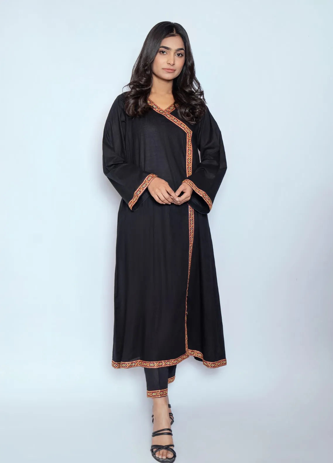 - Black Long Lawn Angrakha With Contrasting Lace Details On The Daman Sleeves And Neckline