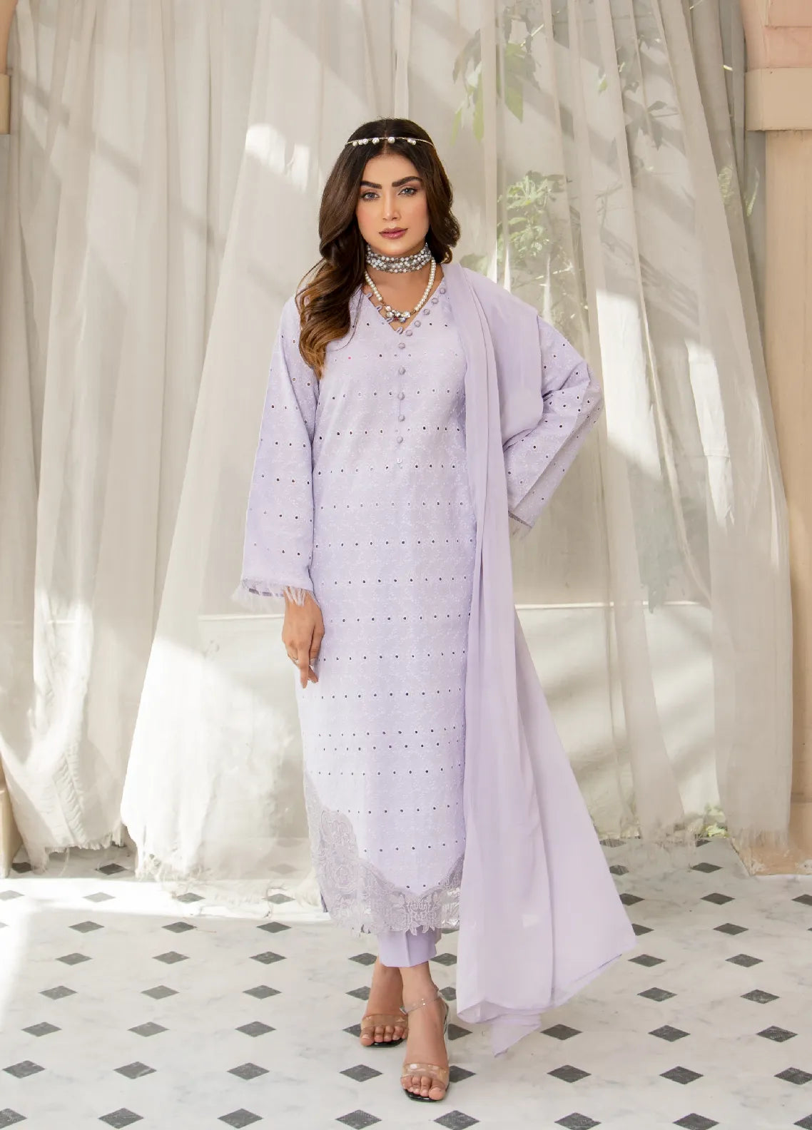 - Lavender Schiffli Shirt With Plain Back Intricate Daman Patch With Cutwork Hem