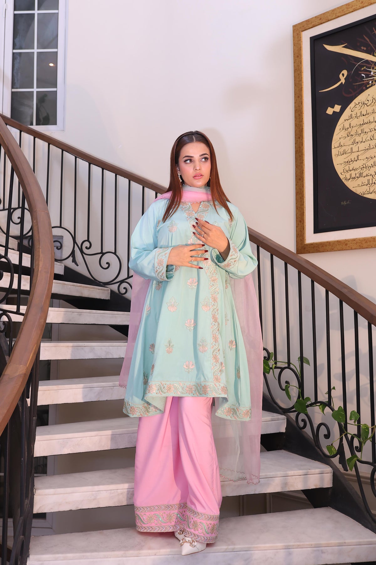 Paired with blush pink straight trousers and a lightweight ombre dupatta in pastel mint and pink, this ensemble exudes sophistication and charm, making it a perfect choice for festive gatherings, weddings, or formal events.