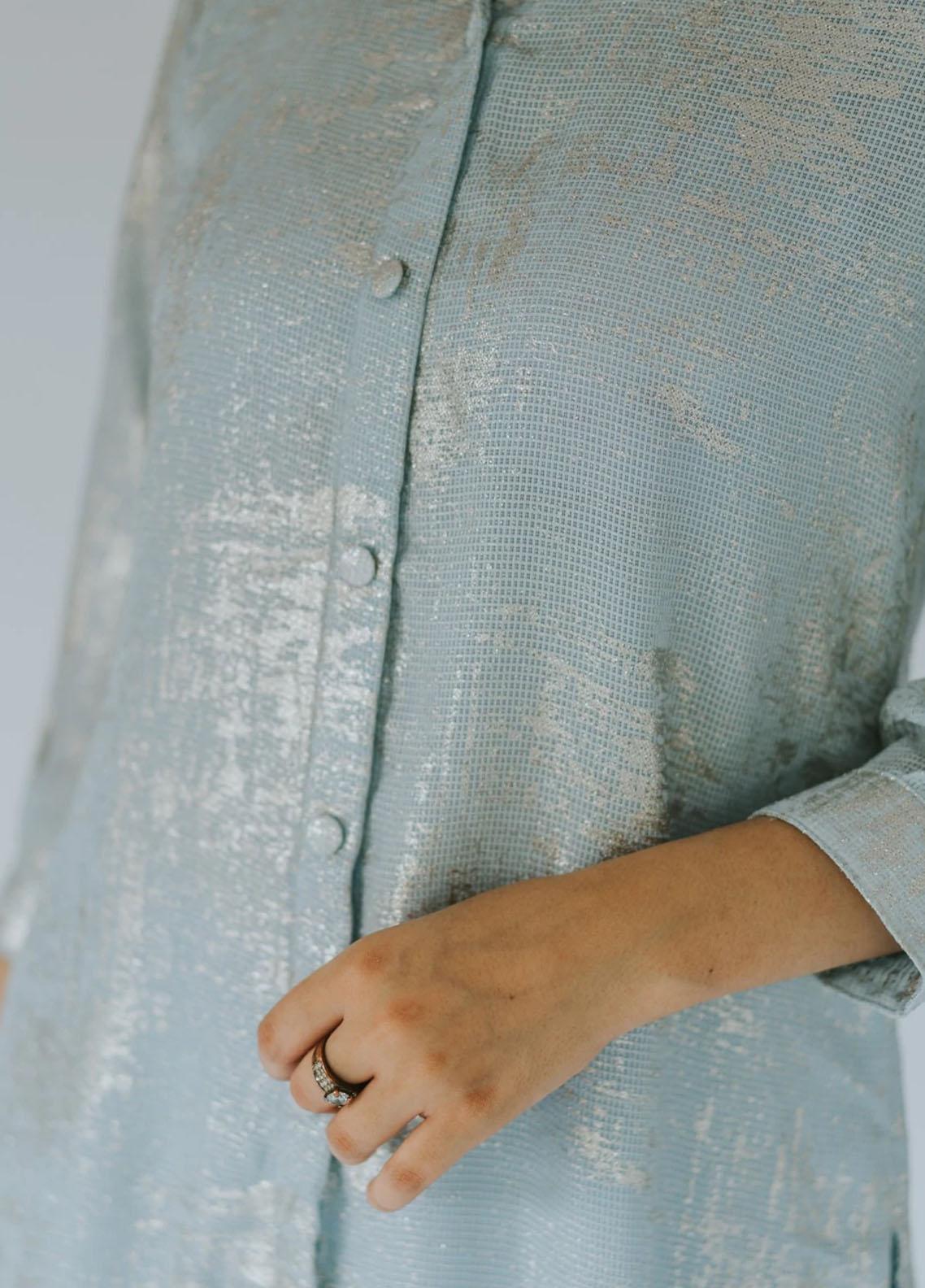 Materials:Top: Imported Jute Net Laced With Threads Of Shimmer Bottoms: Valentino Silk Straight Long Kurta With Hues Of Marina Mist, Ban Neck With Buttons Down The Front And Straight Long Sleeves. Paired With Valentino Silk Ankle Length Culottes.