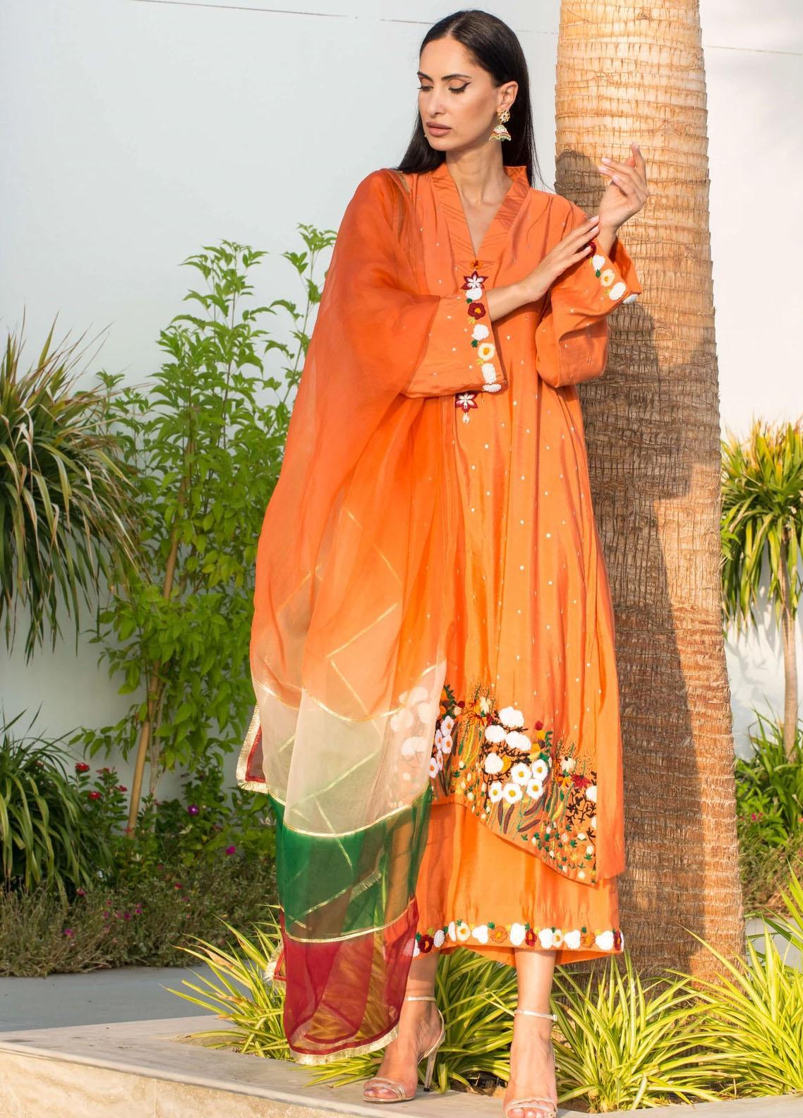 • A Burnt Orange Moment With A Self Lined Kurta, Sequined Handwork And Heavy Embroidery On The Daaman. Paired With Embroidered Hem Culottes And An Organza Dupatta Adorned With Gota Work Around The Borders.