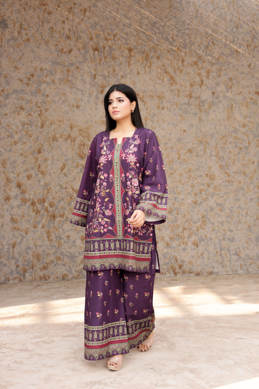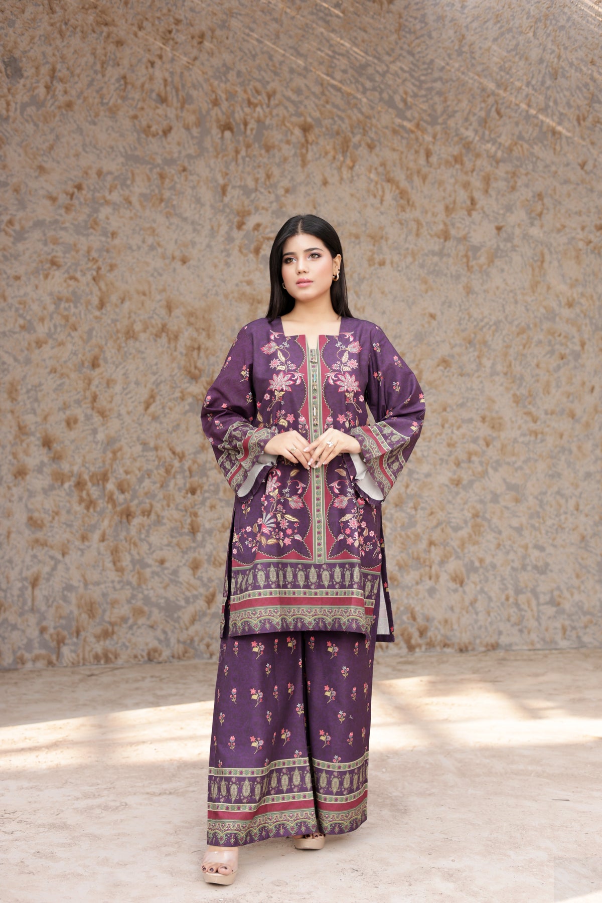 Experience timeless charm with Royal Purple Elegance – Printed 2-Piece, a beautifully designed outfit crafted for women who love refined and graceful style. Featuring a rich purple tone paired with delicate floral patterns and detailed borders, this suit delivers a perfect balance of sophistication and comfort.