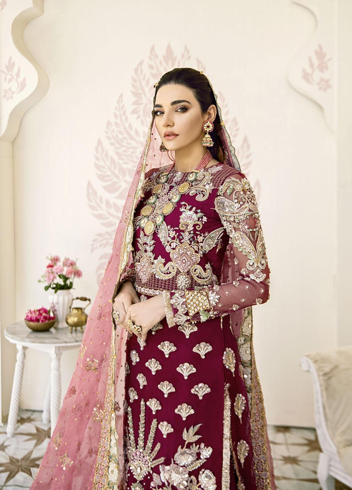 Pois - plum and gold coupled to make the perfect combination of the wedding season with a contrasting pink organza cotton jacquard dupatta sprayed with hand worked and embroidered booti paired with contrasting color-blocked silk borders. The mid calf length shirt is fully hand embellished with gold dabka, nakshi, kora, gotta, gold crystals and swarovskis illuminating the dress. The lower is a raw silk sharara with an embroidered border to give it a complete finished look.
