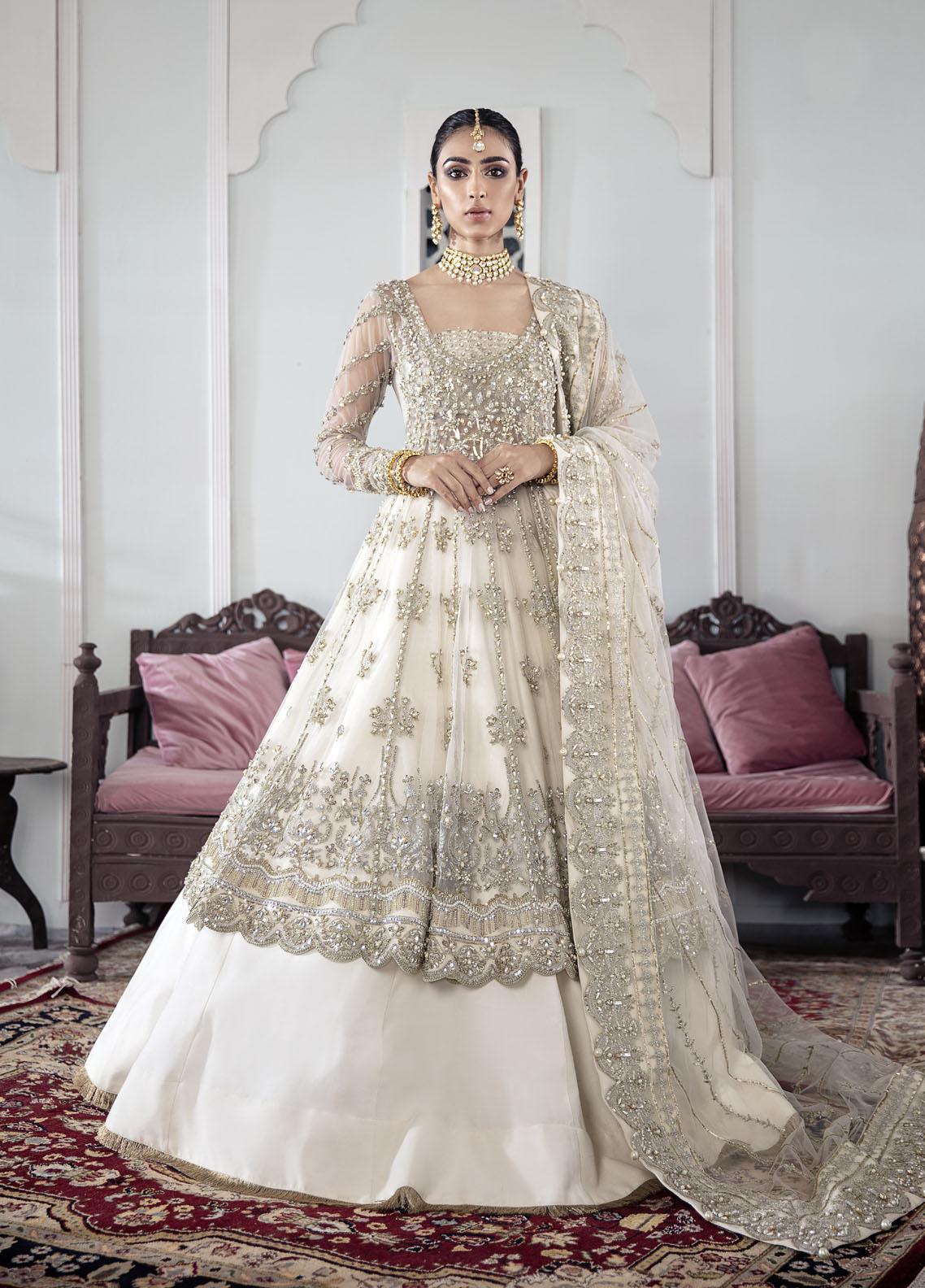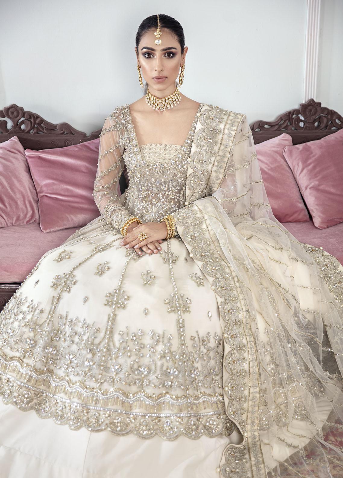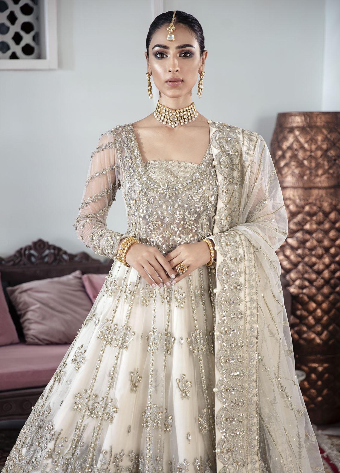 The kalidaar that dreams are made of - presenting Meeral. An 18-paneled kalidaar with an attached bodice and fully embellished bustier for the perfect bridal feel. The outfit features extensive hand embellishments and adda work to give it the royal feel that it deserves. The dupatta is neatly hand worked as well on all 4 sides.