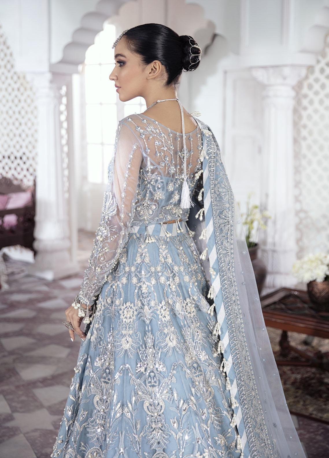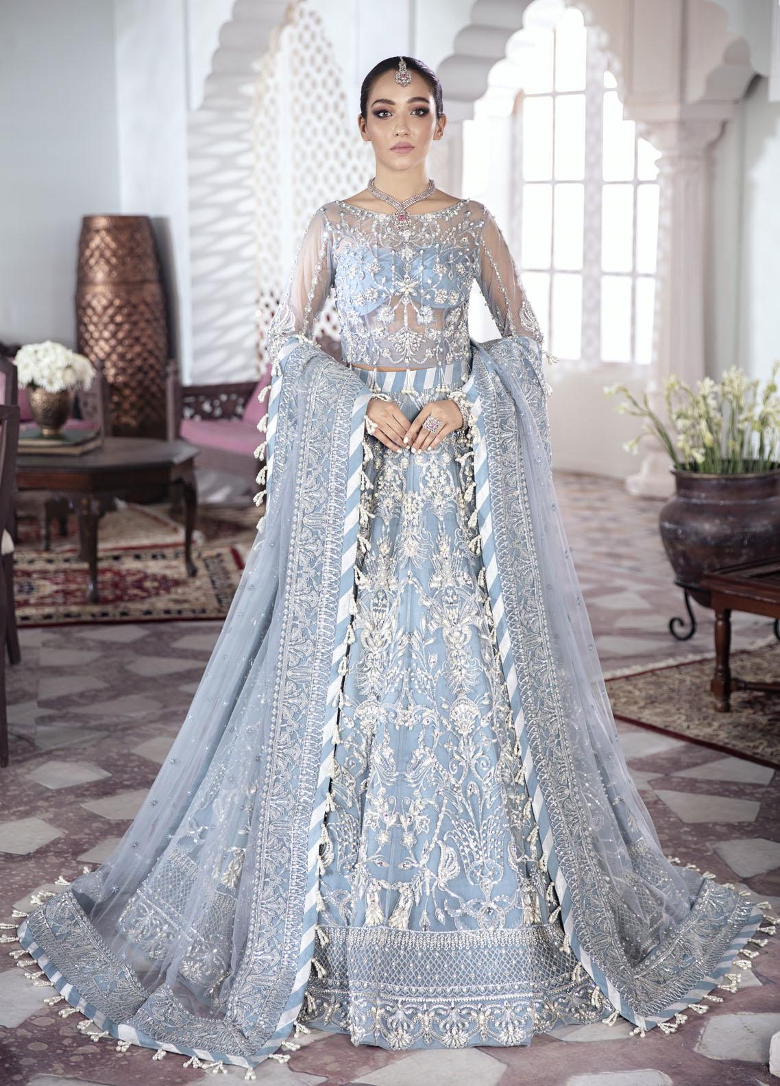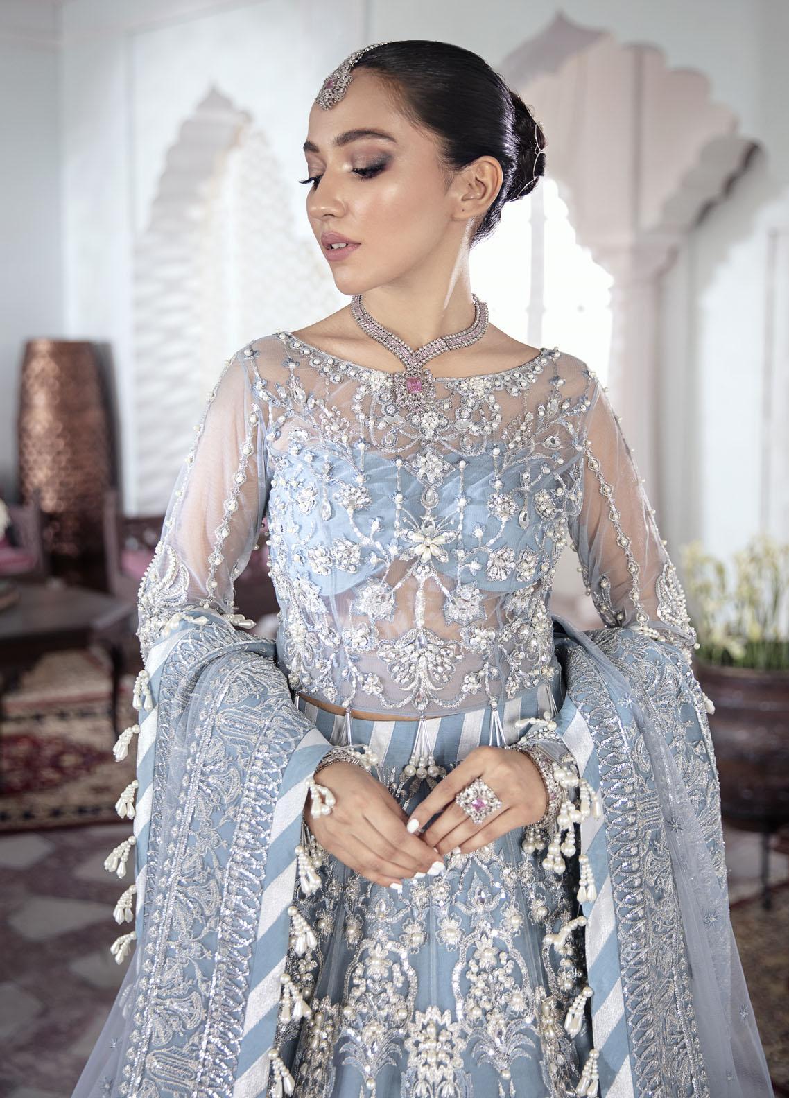 Mehnaaz - is a grey-blue lehnga choli with a floor length lehnga that has heavily hand-worked, fully embroidered panels with silver zari and crystals. The choli features linear patterns along with fully composed sleeves. Paired with touches of 2-tone chatta patti on the lehnga and the fully composed dupatta, the lehnga choli is ideal to be worn at a function by the bride or even by the bridesmaids. The detailing speaks of quintessential Gulaal luxury and intricacy. Intricate french knots bring a touch of modern work into the overall design.