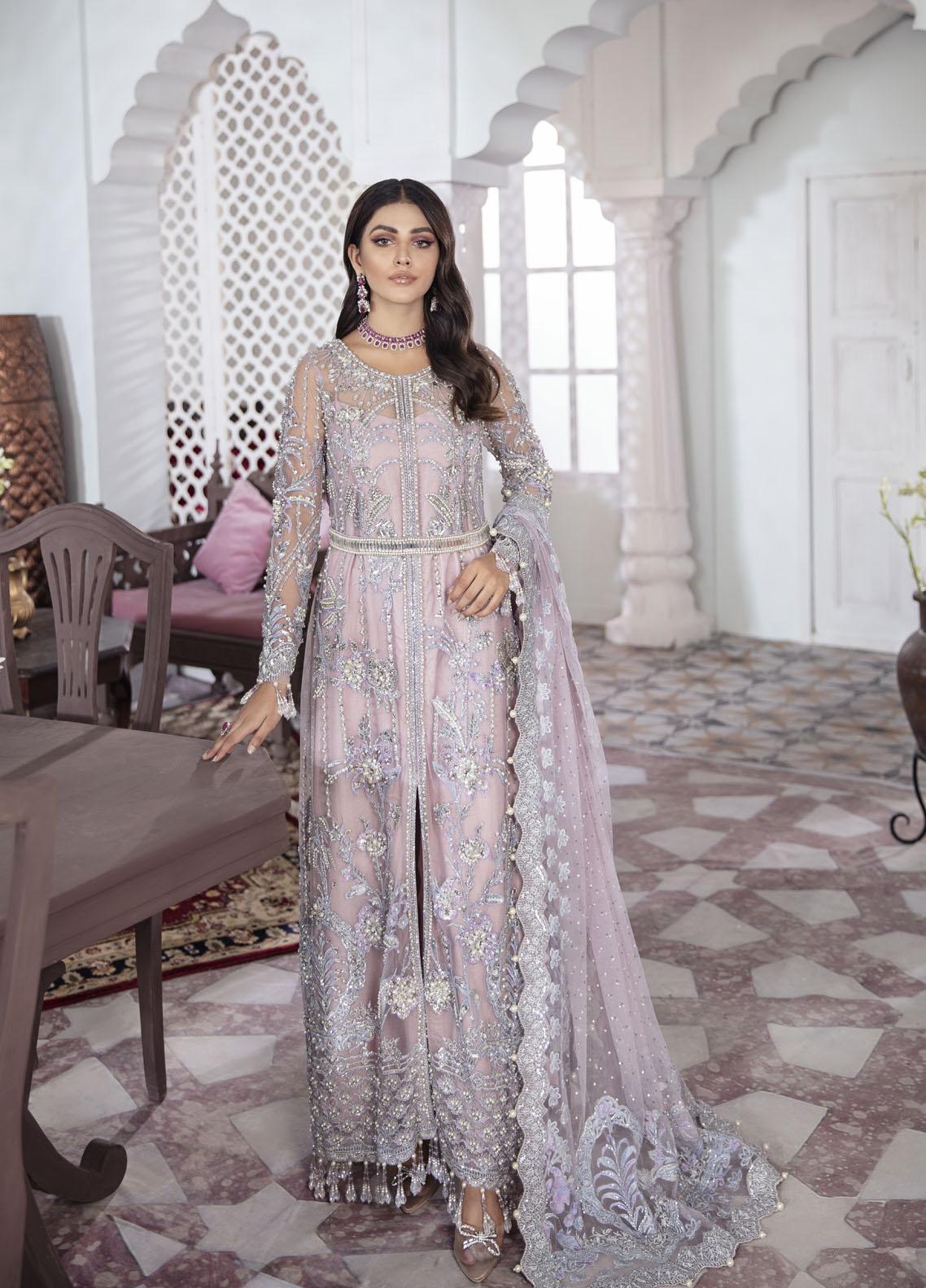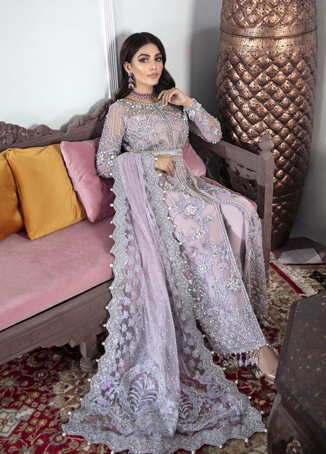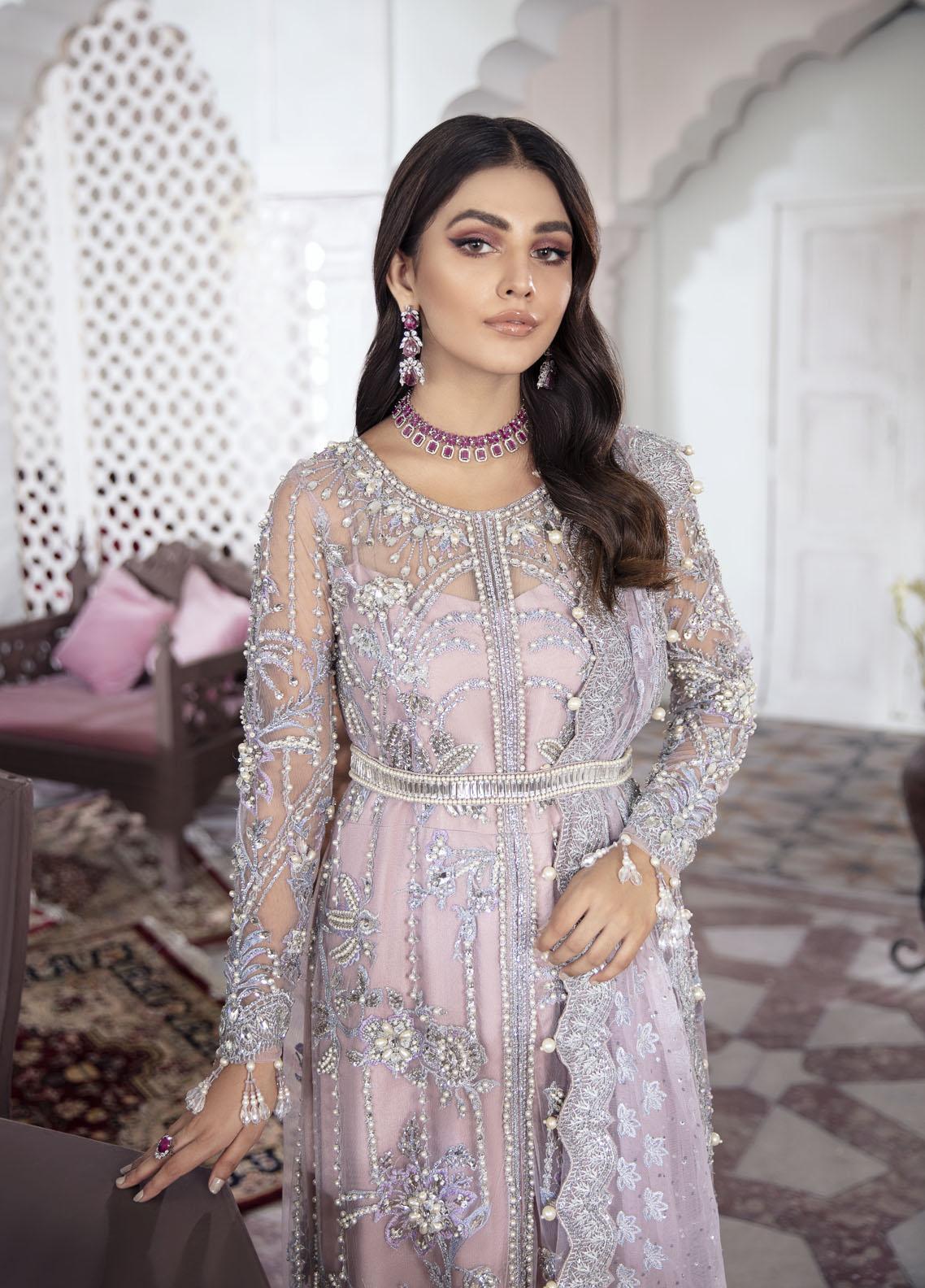 Naaz - a twin paneled shirt attached to a heavily composed and hand-worked bodice with a fully composed shawl adorned with crystal embellishments to give the outfit a sparkly effect. Rendered in shades of lilac, the outfit features extensive use of silver zari.