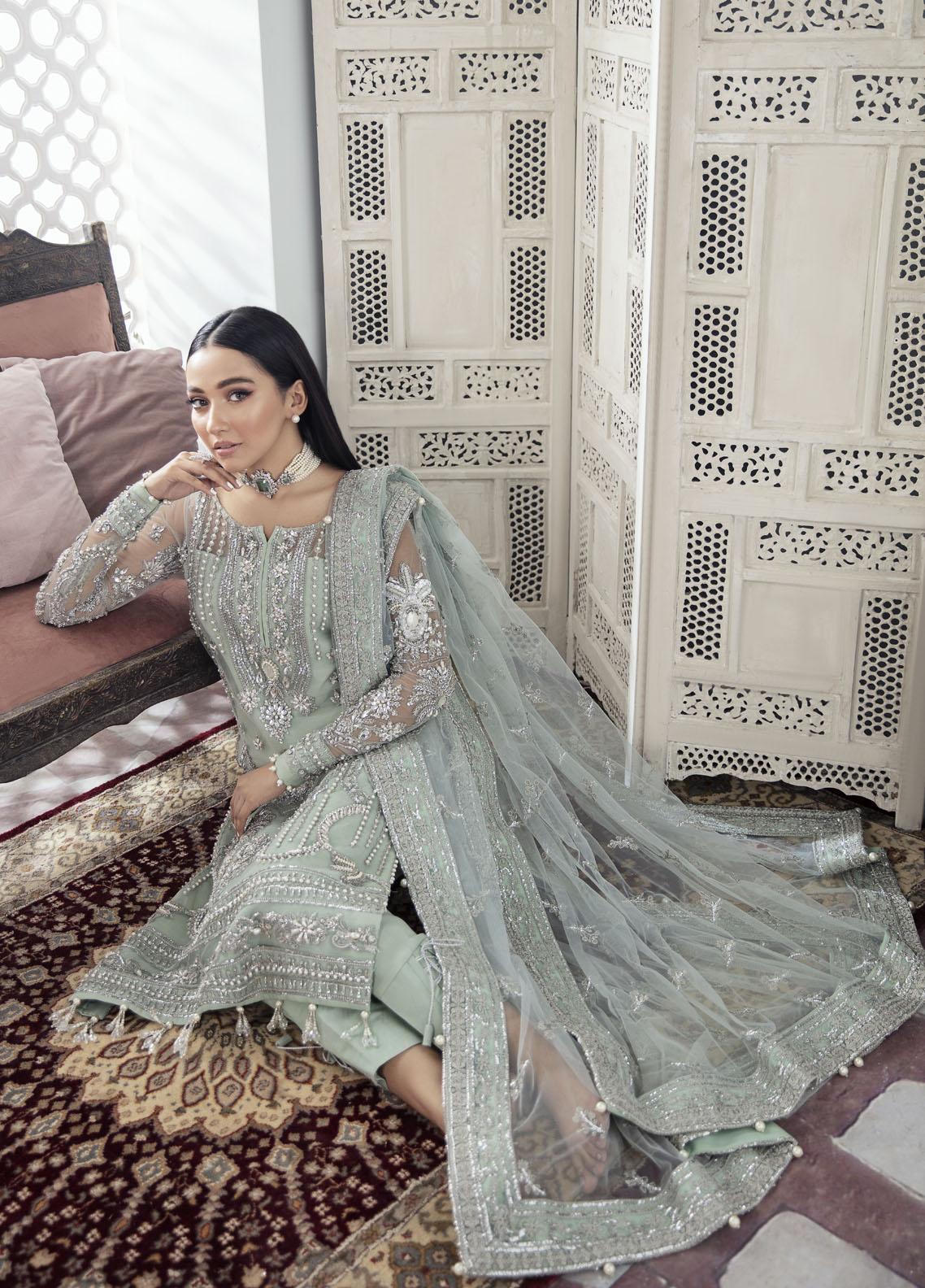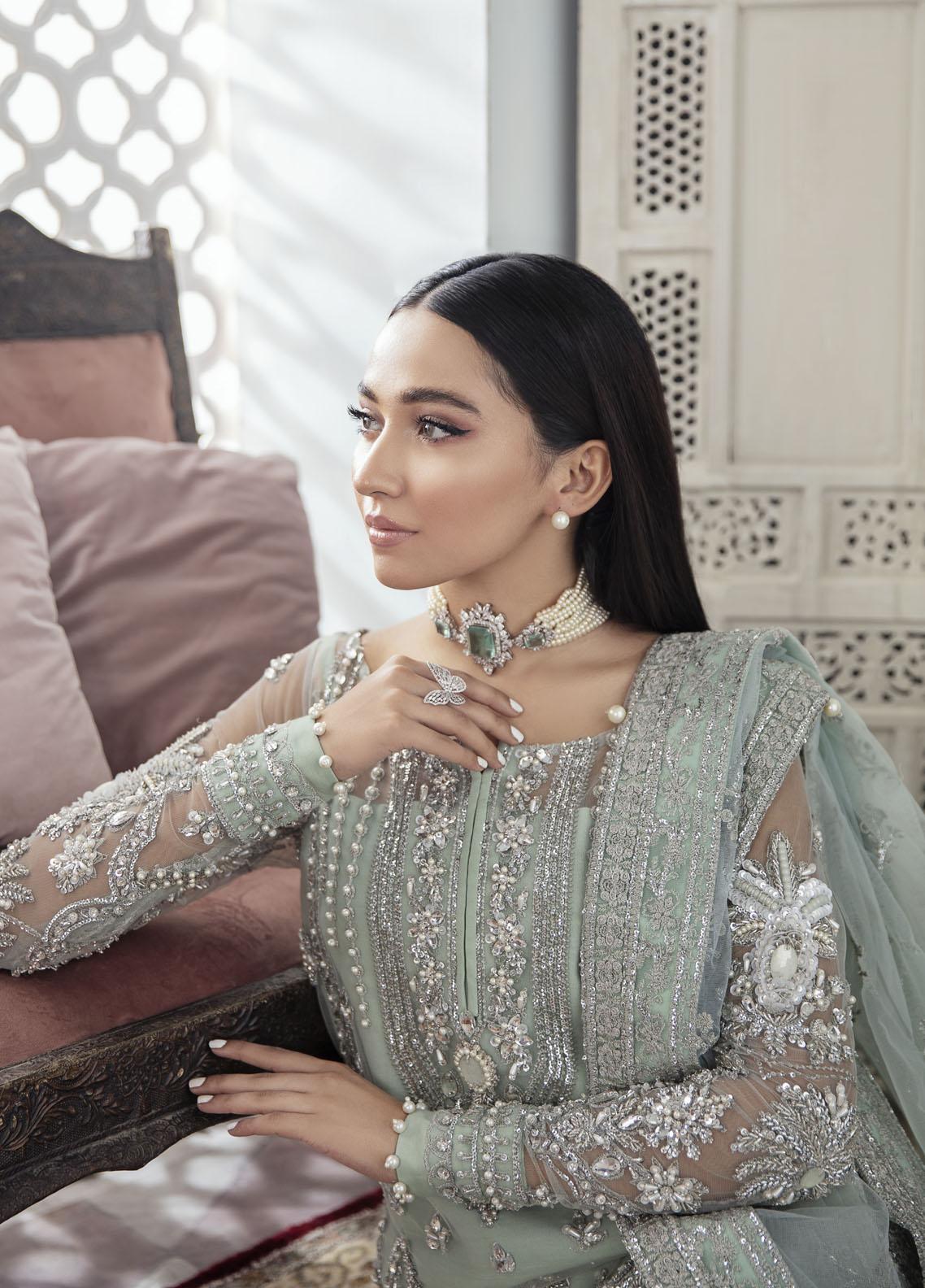 Arjumand - features a classical elegant look with a unique colour palette. Featuring intricately detailed embroideries and adda embellishments on a soft romantic hue of peachy pink, the outfit features a composed dupatta with 4-sided borders and raw silk trousers.