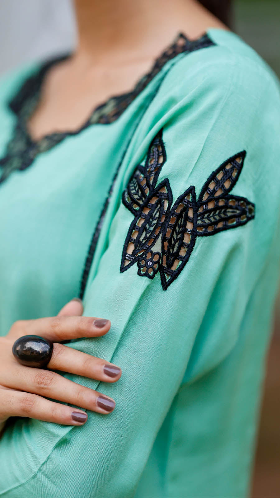 Step into serene sophistication with this mint green ensemble, crafted from airy lawn silk for effortless wearability. The outfit features a straight silhouette shirt adorned with rich black embroidery on the neckline, sleeves, and hem, offering a striking contrast that enhances its festive appeal. Paired with straight trousers and a digitally dyed dupatta in shades of green and black, this look brings together calm tones and bold detailing in a beautiful harmony.