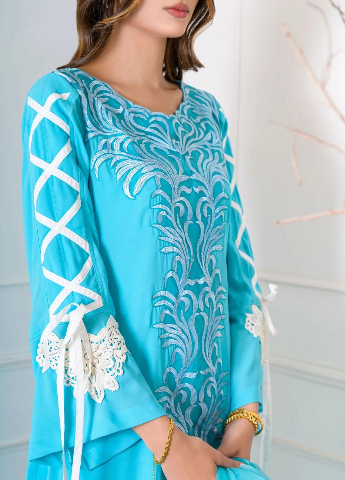 This blue jorjet A line ensemble is a stunning masterpiece There is intricate applique detailing on the neckline It also features lace applique detail over the sleeves It s paired with a straight raw silk pant with lace detail This ensemble is complemented with an organza dupatta with lace all over Model is wearing size small is 5 8 tall