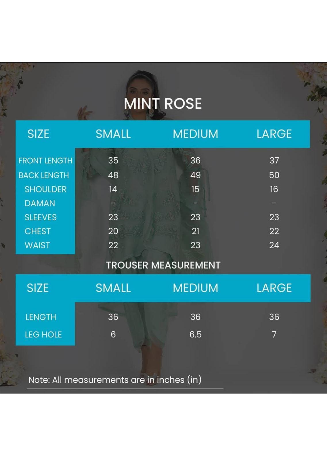 This fabulous mint green outfit features a tail shaped pure organza shirt that is both elegant & stylish. The shirt boasts beautiful threadwork embroidery on the sleeves & scattered embroidered motifs on the shirt. The pearl embellishment adds glamour & sophistication to the overall look. The outfit is completed with a soft organza dupatta featuring cutwork detailing, adding a touch of luxury & grace to the ensemble. Paired with a tulip shalwar that features tissue detail. Model is wearing size small & is 5.9 Inches tall.